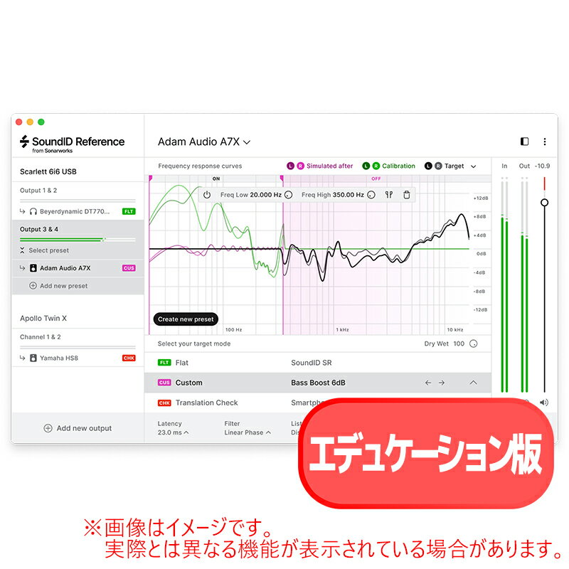 Sonarworks SoundID Reference for Speakers & Headphones (education license) 学生版 ダウンロード版本製品は学生版 (エデュケーション版)です※本製品は、教育機関の教職員ならびに学生、もしくはオンラインレッスンの講師もしくは受講生の方のみがお買い求めの上ご使用いただける特別な製品です。 一般の方のご購入・ご使用はできません。※お客様が優待対象者である事を確認させて頂く為に、ご購入後必ず「学生証」もしくは講師の方はそれを証明する書類のご提示のご提示が必要です。限りなく正確なスピーカー・キャリブレーション※本商品はダウンロード版です。物理的な商品のお届けはございません。※製品のダウンロードアクセスコードを記載したPDFファイルをメール添付で送信することで、納品完了となります。※商品の性質上、誤購入の場合も含めて商品の返品・交換は一切受付いたしません。※ご注文の際は、ご使用になるPCの動作要件なども含めて事前に充分ご確認のうえご注文ください。※Speakers & Headphonesソフトウェアのみ※測定専用マイクは別売り 世界で唯一、スピーカー/ヘッドフォン、全てのPC出力に対応する音響補正ソリューション。 形状・材質など部屋によるモニター・スピーカーへの影響、そしてヘッドフォンの特性によって再現される音響は変わってしまいます。そこでSoundID Reference は、モニターの精度の問題を解消し、他のスピーカーシステムとの親和性を飛躍的に向上させます。 SoundID Reference は測定用ソフトウェアと、DAW側で起動するキャリブレーション・プラグインで構成。その先進のDSPによって、モニタースピーカーに対するルームの影響を中和し、ヘッドフォンはフラットに。より信頼性の高いリファレンス・サウンドを提供します。Reference for Speakers & Headphones・アベレージモデルを使用したヘッドフォン・キャリブレーション・プラグイン・スピーカー測定ソフトウェア + キャリブレーション・プラグイン・AU/AAX/RTAS/VSTプラグインフォーマット対応・Systemwide収録 - OSからの出力もキャリブレート主な特徴DAWプラグイン SoundID Referenceはゼロレイテンシー処理を搭載しているので、レコーディング、プロデュース、ミキシング、マスタリング中でも使用できます。プラグインは様々なフォーマット(AU、AAX Native、RTAS、VST)に対応しているので、あらゆる主要なDAWで動作します。YouTubeやiTunes、Netflixも補正 SooundID ReferenceはDAW上のプラグインでも使用できる上、PCシステム全体でのオーディオをキャリブレーションも可能。iTunesやYouTube、ウェブブラウザ、その他のソフトウェアを使用する際にも、フラットで正確なサウンドを楽しむことができます。フラットに補正、さらにカスタマイズTarget Mode(新機能) 新しいSoundID Referenceはフラットに部屋の音場特性の補正を行った上で、さらに、好みの音場環境の調整が可能になりました。フラット特性のカーブに任意の周波数ポイントでブースト、カットの処理が可能です。そしてカスタマイズした周波数特性は自身のプリセットとして保存が可能。フラットな環境と比較することもかんたんに行えます。まるで複数のスピーカーをもっているかのうようにTranslation Check(新機能) ミックスを行う場合、様々なリスナーの聞く環境を考慮した調整が必要になります。「Translation Check」は車のステレオやイヤフォンのモデル、さらにはテレビで聞いた場合までを再現し、様々な音響環境を想定したチェックが可能です。「Translation Check」の機能は使用しているヘッドフォンやスピーカーをキャリブレーションした上で適用することができるため、ヘッドフォンやスピーカーの特性に依存しないでサウンドチェックができます。製品比較表関連タグ:ソナーワークス ik multimedia arc system エデュケーション アカデミック仕様詳細・対応動作要件は、本製品メーカーサイト情報をご参照の上、お買い求めください。
