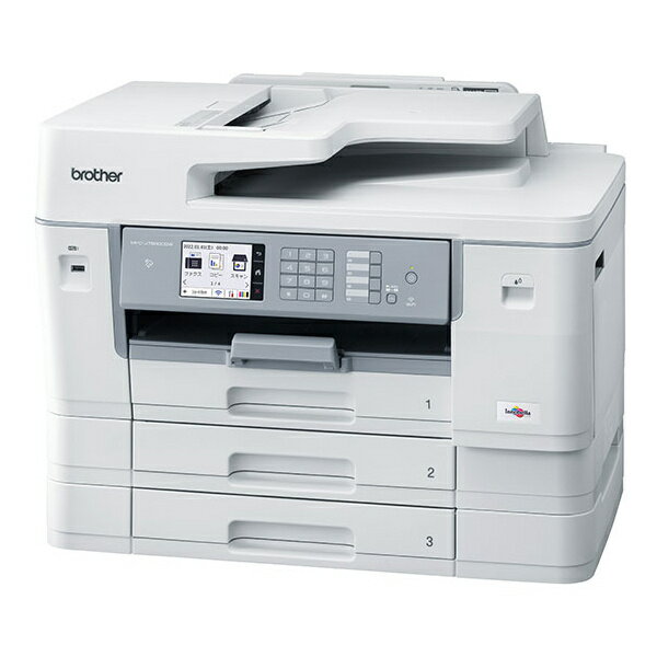 大容量ファーストタンク A3インクジェット複合機 (FAX/ADF/30万ページ耐久/自動両面/3段トレイ) ●3段用紙トレイ&背面多目的トレイを搭載したA3対応フラッグシップ複合機●大容量インクカートリッジ対応で、インク交換の回数を大幅に削減●耐久枚数約30万ページまたは7年間の高耐久を実現●A3プリント/A3コピー/A3スキャン/A3ファクス/A3PCファクス●自動両面プリント対応●両面同時スキャン対応●用紙トレイ3段:各最大250枚●多目的トレイ:最大100枚●ADF(自動原稿送り装置):50枚●タッチパネル液晶:3.5型●インターフェイス:USB/有線LAN/無線LAN●Wi-Fi Direct対応●スマホ/タブレット接続 ※スマホ/タブレットにて使用する場合、専用アプリのインストールが必要です●対応消耗品:LC417XLBK/LC417XLC/LC417XLM/LC417XLY 詳細スペック 印刷方式カラーインクジェット 解像度最大1200×4800dpi インクタイプ顔料系インク インク色数・ノズル数4色 インクカートリッジタイプ各色独立型 最大印字サイズA3 印字速度(モノクロ)30ppm 印字速度(カラー)30ppm ダイレクト印刷機能対応 ふちなし印刷機能対応 CD/DVD印字機能未対応 両面印刷機能対応 カラー液晶ビューワあり 3.5型TFT 給紙方式給紙トレイ/多目的トレイ 給紙容量給紙トレイ(最大A3):普通紙750枚/多目的トレイ(最大A3):100枚 インターフェースHi-SpeedUSB2.0、有線LAN(10/100BASE-TX)、無線LAN(IEEE802.11b/g/n) メモリカードスロットあり USBフラッシュメモリー(256GBまで) ドライバー対応ソフトWindows11/10/8.1/7SP1、WindowsServer2022/2019/2016/2012/2012R2/2008/2008R2、macOSv10.15.X、ChromeOS ※最新の対応状況についてはブラザーHPをご確認ください その他同梱品CD-ROM、スターターインクカートリッジ、取扱説明書、A4用紙(普通紙)、電話機コード、紙詰まり解消シート、ローラークリーニングキット、保証書他印刷物 稼動音約50dBA 本体サイズ(H×W×D)445×576×477mm(突起部を除く) 本体重量約27.5kg(消耗品含む) 電源AC100V50/60Hz 備考印字スピードの単位はipmです。 エコマーク登録 国際エネルギースター登録 GPN(グリーン購入ネットワーク)登録 VCCI対応 最大消費電力30W 待機時消費電力約6.5W スリープ時消費電力約0.9W 電気用品安全法(本体)非対象 電気用品安全法(付属品等)適合/例外承認 電気用品安全法(備考)本体:電気用品安全法の定める「特定電気用品」もしくは「特定電気用品以外の電気用品」に該当しない。ACコード:PSEマーク表示。