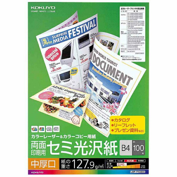 【B4サイズ】KOKUYO/カラーレーザー&カラーコピー LBP-FH2800 中厚口仕様 両面印刷用 セミ光沢紙 100枚 両面印刷が可能な落ち着いた風合いのセミ光沢紙 コクヨ