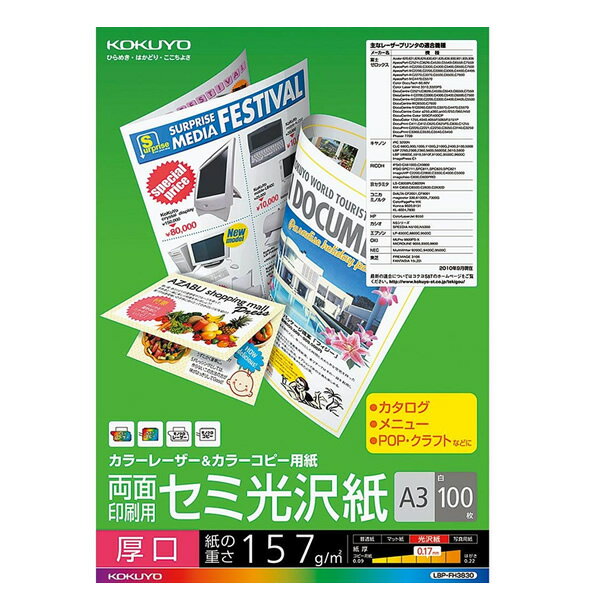 KOKUYO/カラーレーザー&カラーコピー用紙 ○両面印刷がオフセットと同品質の仕上がり。 ○反射を抑えたセミ光沢紙です。 ○パンフレットや両面ポスターなどが美しく仕上がります。 ※印刷後の光沢感は、お使いの機種により異なります。 ※用紙厚さ157g/m2以上に対応する機種でお使いください。 サイズ A3 タテ×ヨコ 420×297mm 仕様 厚口 紙厚 157g/m2・0.17mm 枚数 100枚 白色度 82%程度(ISO) 備考 両面印刷用紙A3サイズ(LBP-FH1830) サイズ:420×297mm 仕様:標準 枚数:100枚入り B4サイズ(LBP-FH1800) サイズ:364×257mm 仕様:標準 枚数:100枚入り A4サイズ(LBP-FH1810) サイズ:297×210mm 仕様:標準 枚数:100枚入り A4サイズ(LBP-FH1815) サイズ:297×210mm 仕様:標準 枚数:250枚入り A3サイズ(LBP-FH2830) サイズ:420×297mm 仕様:中厚口 枚数:100枚入り B4サイズ(LBP-FH2800) サイズ:364×257mm 仕様:中厚口 枚数:100枚入り A4サイズ(LBP-FH2810) サイズ:297×210mm 仕様:中厚口 枚数:100枚入り A3サイズ(LBP-FH3830) サイズ:420×297mm 仕様:厚口 枚数:100枚入り B4サイズ(LBP-FH3800) サイズ:364×257mm 仕様:厚口 枚数:100枚入り A4サイズ(LBP-FH3810) サイズ:297×210mm 仕様:厚口 枚数:100枚入り