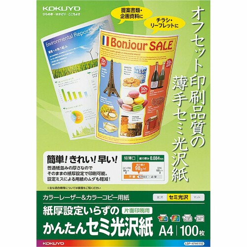 KOKUYO|コクヨ “カラーレーザー&カラーコピー用” かんたんセミ光沢紙 (A4サイズ・100枚) LBP-KFH1110[LBPKFH1110]