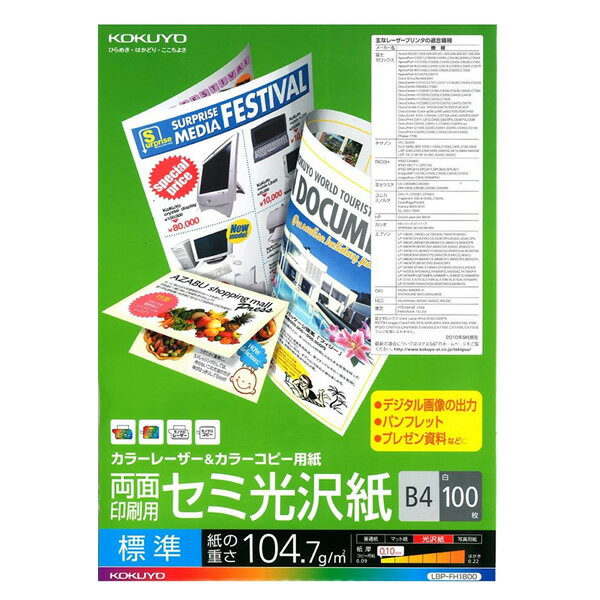 【B4サイズ】KOKUYO/カラーレーザー&カラーコピー用紙 LBP-FH1800 標準仕様 両面印刷用 セミ光沢紙 100枚 両面印刷が可能な落ち着いた風合いのセミ光沢紙 コクヨ