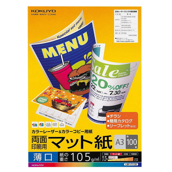 【A3サイズ】コクヨ/カラーレーザー&カラーコピー用紙(LBP-F1130) 100枚 薄口 両面印刷用 幅広い用途に使えるスタンダードなマット紙 KOKUYO