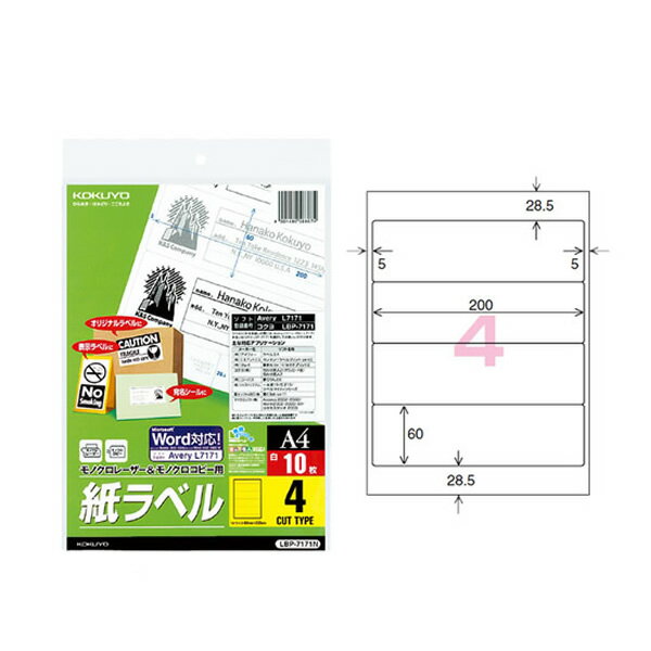 KOKUYO/モノクロレーザー&モノクロコピー用 紙ラベル ●専用のラベル作成ソフトがなくても、簡単にラベル作成ができます。 ●プリンタ通紙時の熱量に耐える粘着剤を使用しています。 ●Microsoft®Word・Accessをはじめ、さまざまなソフトに対応! ※低速レーザープリンタ・PPC(20枚/分程度)でお使いください。 ※用紙厚さ139g/m2以上に対応する機種でお使いください。 ※用紙種類が選択できる機種で「ラベル紙」または「厚紙」に設定し、印刷してください。 サイズ A4 面数 4面 1片の大きさ 60・200 枚数 10枚 紙厚 ラベル本体=0.07mm(総厚139g/m2・0.15mm) 白色度 85%程度(ISO)A4サイズ(LBP-7171N) 面数:4面(角丸) 1片の大きさ:60×200mm 枚数:10枚 A4サイズ(LBP-7172N) 面数:18面(角丸) 1片の大きさ:30×100mm 枚数:10枚 A4サイズ(LBP-7170N) 面数:24面(角丸) 1片の大きさ:11×134mm 枚数:10枚 A4サイズ(LBP-7167N) 面数:1面(角丸) 1片の大きさ:289×199.6mm 枚数:20枚 A4サイズ(LBP-7168N) 面数:2面(角丸) 1片の大きさ:143.5×199.6mm 枚数:20枚 A4サイズ(LBP-7169N) 面数:4面(角丸) 1片の大きさ:139×99.1mm 枚数:20枚 A4サイズ(LBP-7166N) 面数:6面(角丸) 1片の大きさ:93.1×99.1mm 枚数:20枚 A4サイズ(LBP-7165N) 面数:8面(角丸) 1片の大きさ:67.7×99.1mm 枚数:20枚 A4サイズ(LBP-7173N) 面数:10面(角丸) 1片の大きさ:57×99.1mm 枚数:20枚 A4サイズ(LBP-7164N) 面数:12面(角丸) 1片の大きさ:72×63.5mm 枚数:20枚 A4サイズ(LBP-7163N) 面数:14面(角丸) 1片の大きさ:38.1×99.1mm 枚数:20枚 A4サイズ(LBP-7162N) 面数:16面(角丸) 1片の大きさ:33.9×99.1mm 枚数:20枚 A4サイズ(LBP-7161N) 面数:18面(角丸) 1片の大きさ:46.6×63.5mm 枚数:20枚 A4サイズ(LBP-7160N) 面数:21面(角丸) 1片の大きさ:38.1×63.5mm 枚数:20枚 A4サイズ(LBP-7159N) 面数:24面(角丸) 1片の大きさ:33.9×64mm 枚数:20枚
