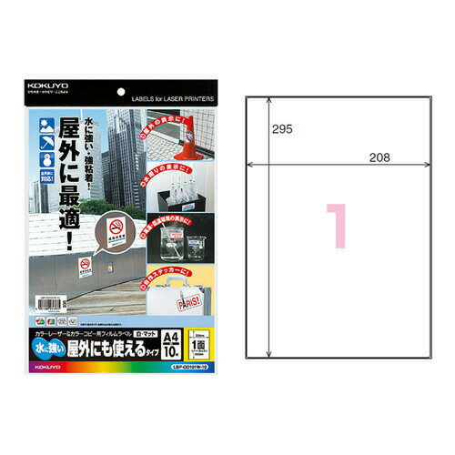 【A4・1面・10枚】KOKUYO/カラーレーザー&カラーコピー用フィルムラベル LBP-OD101W-10 白・マット 10枚 耐水性に優れた強粘着タイプ、水まわりや屋外に使用に最適 コクヨ