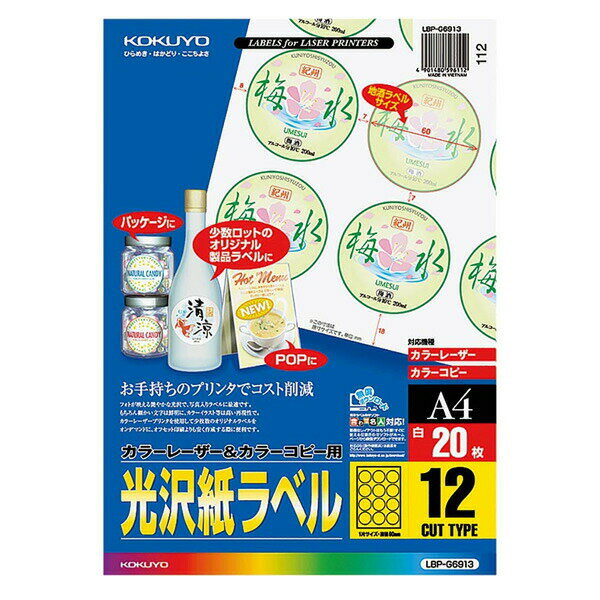 【A4・12面・地酒ラベル用】KOKUYO/カラーレーザー&カラーコピー用光沢紙ラベル LBP-G6913 20枚 美しく仕上がる光沢紙ラベル コクヨ