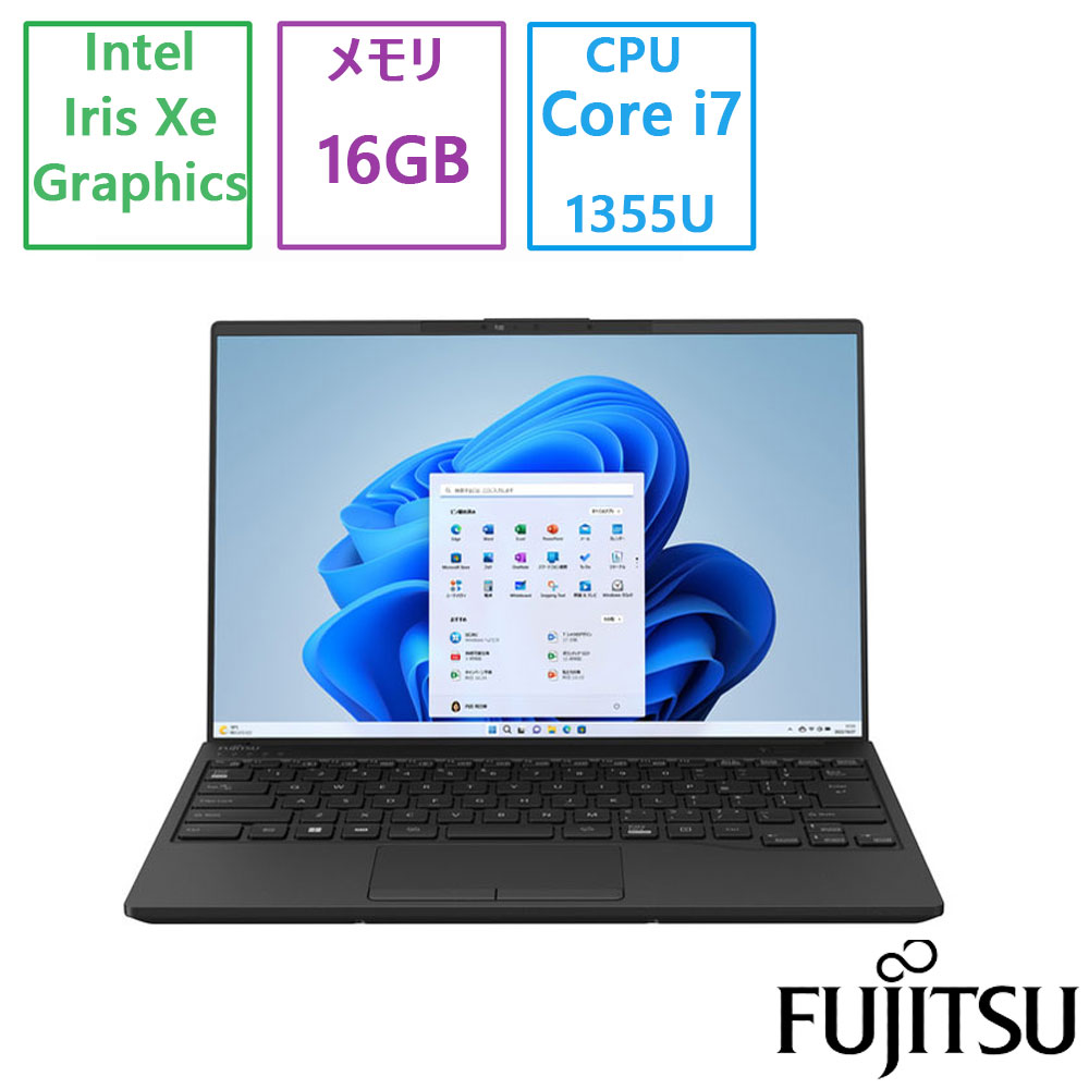 もっと身軽に14.0型ワイド軽量モバイルノートPC■フットワークを高めるモバイル性能■長時間駆動仕事からプライベートまで様々なシーンでより身軽に使えるように、最大約30.0時間のバッテリー持ちを実現。外出時にも快適に使用できます。※動画再生時約11.5時間、アイドル時約30.0時間(JEITA測定法Ver. 3.0に基づいて測定した駆動時間目安)■堅牢日常で起こりうる様々なケースを想定し、設計段階での厳しい品質試験を実施しています。UHシリーズは富士通独自の試験に加え、アメリカ国防総省が制定したMIL規格(MIL-STD-810H)に準拠したテストもクリアしているのでさらに安心です。※いずれの試験内容も、無破損、無故障を保証するものではありません■充電約1時間で満充電の約80%まで充電できる急速充電に対応しており、突然の外出前にも安心です。お手持ちのモバイルバッテリーでの充電も可能なので、外出先での充電切れも心配無用です。※7.5W(5V/1.5A)以上を供給可能なUSBPowerDelivery対応機器であれば、本体に充電できます。ただし、すべての対応機器の動作を保証するものではありません。■インテルEvoエディション準拠進化を続けるAIの可能性を広げるインテルCoreUltraプロセッサー搭載。CPUに加え、AI専用エンジン(NPU)「インテルAIBoost」、GPU「インテルArcグラフィックス」の3つのエンジンを搭載し、圧倒的パフォーマンスと高い電力効率を実現します。■更なる高性能を発揮CPUを強力に冷却するデュアルファンを搭載することで28WのCoreUltra7-155Hの性能を引き出し、より快適な作業を行えます電源モード設定を出荷時の「バランス」から「最適なパフォーマンス」に変更することで、CPUのパフォーマンスを最大TDP(熱設計電力)の28Wまで向上させることができます。■ディスプレイ従来の13.3型と比較し17%の画面サイズアップを実現した、縦横比16:10の大画面14.0型ワイド液晶搭載。画面占有率93%を誇る超狭額縁で、プライベートにもビジネスにも大活躍です。■キーボードコンパクトな筐体に、キーピッチ約19mmのフルサイズキーボードを搭載。キーストロークは約1.5mm、キーの重さは指の力に合わせて2段階に調整。バックライトキーボードなので暗い場所でも快適にキー入力が可能です。■豊富なインターフェース軽量・コンパクトなボディに充実のコネクタ類を搭載しています。出先で変換ケーブルが無くて困るようなことはありません。USBType-Cコネクタを2つ搭載し、更に多くの機器とつながるようになりました。■セキュリティ電源ボタンにはWindowsHello対応指紋センサーを搭載。外出先でマスクをつけたままでもログイン可能。Webカメラにはプライバシーカメラシャッターを搭載。使わない時はシャッターで閉じてプライバシーを守ります。