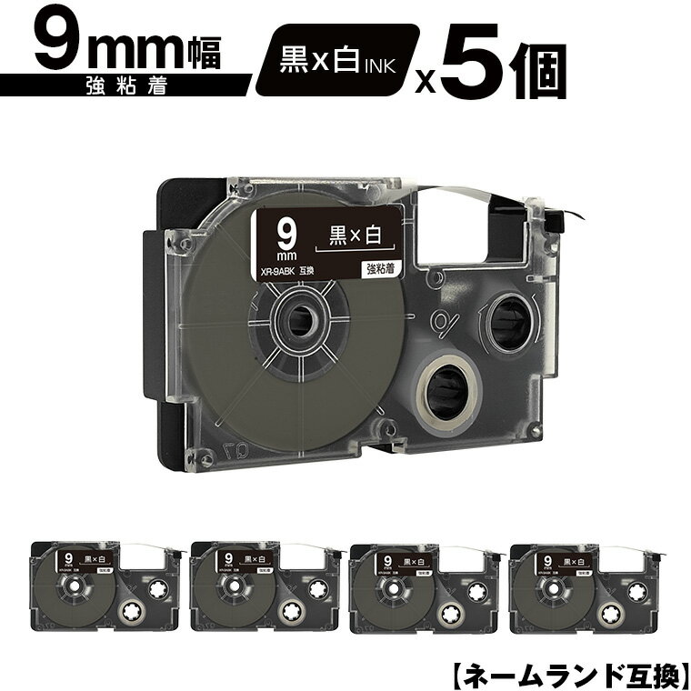 カシオ用 ネームランド XR-9ABK 9mm 黒テープ 白文字 強粘着 5個セット メール便 送料無料 互換テープ ラベル テープカートリッジ ネームランドテープ対応 KL-H5 KL-880 KL-AZ1 KL-E20 KL-P7A KL-H10GN KL-H10BU KL-S20 KL-S10 KL-P7B KL-H20 EC-K10 EC-P10 EL-700