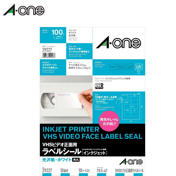 【A4・10面】エーワン/インクジェットプリンタ対応ラベルシール・光沢紙(29227)10シート・100片 VHSビデオ正面用 乾きが早く、色鮮やか!写真も文字もキレイに印刷/A-one