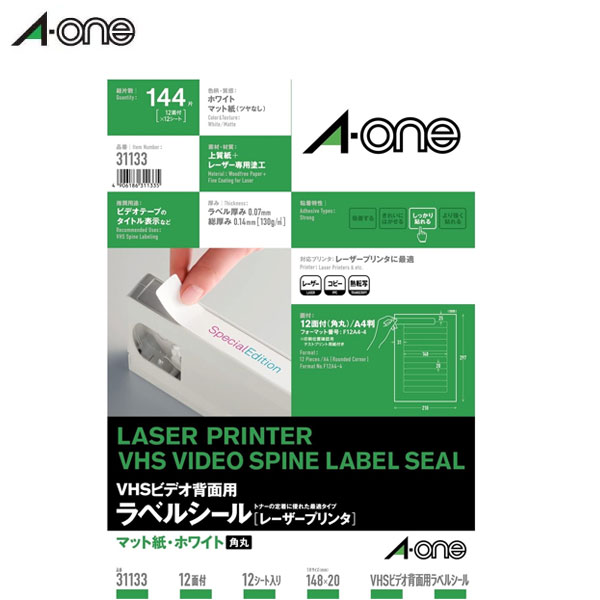 [エーワン VHSビデオ背面用ラベルシール マット紙・ホワイト A4 12面 四辺余白付 角丸 12シート入り A-ONE.31133] の商品説明●レーザープリンタでの印字適性に優れたラベルシールです。●VHSビデオ背面用のラベルが手軽にキレイに作れます。●特殊加工でトナー定着抜群。カラーレーザープリンタでも使用できます。[エーワン VHSビデオ背面用ラベルシール マット紙・ホワイト A4 12面 四辺余白付 角丸 12シート入り A-ONE.31133]のスペック●対応プリンタ:レーザープリンタ(カラーレーザー・モノクロレーザーに対応)、コピー機(カラーコピー機に対応)、熱転写(カラーレーザー・モノクロレーザーに対応)●シートサイズ:A4判(210×297mm)●一片サイズ:148mm×20mm●面付:12面 1列×12段●厚み:130g/m2(0.14mm)●ラベル・カード厚み:0.07mm●材質:上質紙+レーザー専用塗工●白色度:82%●入数:12シート(144片)○返品不可対象商品