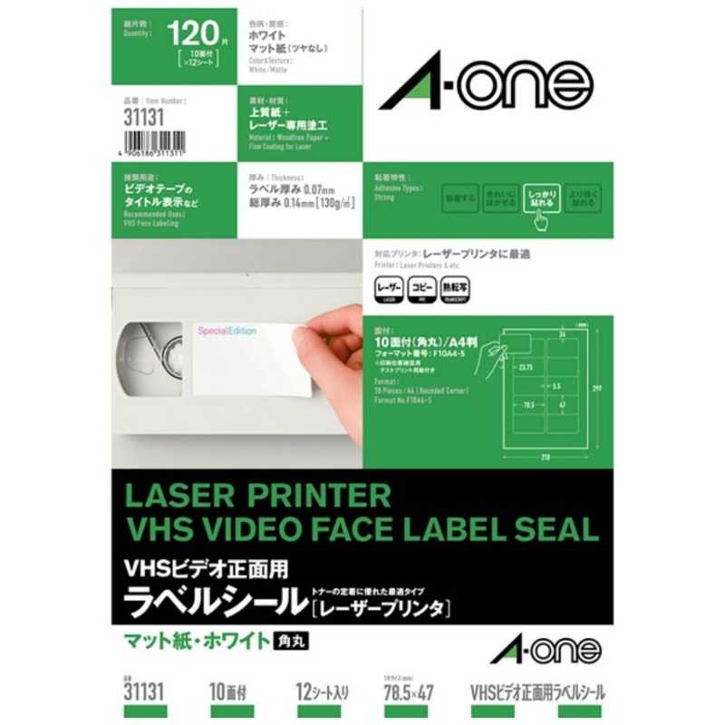 [エーワン VHSビデオ正面用ラベルシール マット紙・ホワイト A4 10面 四辺余白付 角丸 12シート入り A-ONE.31131] の商品説明●レーザープリンタでの印字適性に優れたラベルシールです。●VHSビデオ正面用のラベルが手軽にキレイに作れます。●特殊加工でトナー定着抜群。カラーレーザープリンタでも使用できます。[エーワン VHSビデオ正面用ラベルシール マット紙・ホワイト A4 10面 四辺余白付 角丸 12シート入り A-ONE.31131]のスペック●対応プリンタ:レーザープリンタ(カラーレーザー・モノクロレーザーに対応)、コピー機(カラーコピー機に対応)、熱転写(カラーレーザー・モノクロレーザーに対応)●シートサイズ:A4判(210×297mm)●一片サイズ:78.5mm×47mm●面付:10面 2列×5段●厚み:130g/m2(0.14mm)●ラベル・カード厚み:0.07mm●材質:上質紙+レーザー専用塗工●白色度:82%●入数:12シート(120片)○返品不可対象商品