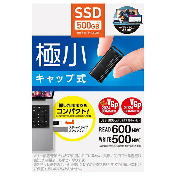 極小サイズでパソコン、テレビ、ゲーム機などに挿したままでもコンパクト。キャップでUSBコネクターへのゴミやホコリなどをブロックできるUSB 10Gbps(USB3.2(Gen2))外付けポータブルSSDです。極小USBメモリサイズで読み込み最大600MB/sの高速データ転送を実現します。■挿したままでもコンパクトな極小キャップ式USB 10Gbps(USB3.2(Gen2))外付けSSDキャップでUSBコネクターへのゴミやホコリなどをブロックできる、挿したままでもコンパクトな極小キャップ式USB 10Gbps(USB3.2(Gen2))外付けSSDです。■コンパクトで持ち運びや収納にも便利な極小USBメモリサイズ重さ約6g、幅約35.9mm×奥行約15.0mm×高さ約7.3mmで従来のスティックタイプのエレコム社製外付けSSDよりコンパクトで、持ち運び、収納に便利なことに加えて、パソコン、テレビやゲーム機などに挿したままでも邪魔にならない極小USBメモリサイズです。■高速データ転送を実現読み込み最大600MB/s、書き込み最大500MB/sの高速データ転送を実現しています。■ストラップホールを装備お好みのストラップを装着できるストラップホールを装備しています。※本製品にストラップは付属していません。■各社デジタルテレビに接続可能シャープ(アクオス)、ソニー(ブラビア)、レグザ、パナソニック(ビエラ・ディーガ)、ハイセンス、LGエレクトロニクスなどのデジタルテレビに接続可能です。■先方互換が可能USB2.0への先方互換が可能で、そのまま接続できます。※USB 10Gbps(USB3.2(Gen2))でご使用になるには、機器側がUSB 10Gbps(USB3.2(Gen2))に対応している必要があります。■対応情報について最新テレビ機種との対応情報は、エレコムホームページにて随時更新しているため、パッケージに掲載のQRからすぐに確認ができます。※ただし、テレビがUSB-HDD録画に対応している必要があります。■テレビやレコーダーに接続テレビやレコーダーに接続することで、番組の録画や2番組同時録画などのさらに便利な機能もご利用いただけます。※機能の詳細、対応可否はテレビ側の仕様に依存します。■より快適なゲームプレイが可能PlayStation 4、PlayStation 4 Pro、PlayStation 5に接続し、ゲームデータを外付けSSDに保存することで、ゲームの起動時間やセーブデータのロード時間が短縮され、より快適なゲームプレイが可能です。■PlayStation 5の空き容量を確保可能PlayStation 5に接続し、PlayStation 5のゲームデータを外付けSSDに保存することで、本体ストレージの空き容量を確保できます。※PlayStation 5で使用する場合は、PlayStation 4のソフトプレイ時のみ可能となります。※PlayStation 5のゲームデータを外付けSSDから起動することはできません。■保証期間は「1年」保証期間を「1年間」としていますので、安心してご利用いただけます。■高い耐衝撃性能と耐振動性能衝撃や振動によって破損しやすいディスク駆動部品がないため、高い耐衝撃性能と耐振動性能を兼ね備えています。■消費電力を大幅に抑えられるモーターなどの駆動部品がないため、書き込み時の騒音もなく、HDDに比べて消費電力を大幅に抑えられます。■USBバスパワー駆動外部電源を必要としないUSBバスパワー駆動なので、USBポートに接続するだけですぐに使えます。■SSDで、PS4の“ゲームデータ”のロード時間を高速化!SSDをPlayStation4、PlayStation4 Proに接続し、ゲームアプリをインストールすることで、ゲームのロード時間や、セーブデータロード時間が高速化できます。■大切なビジネスデータも安心して扱える!エレコム社Webサイトからダウンロードすることで、パスワード自動認証機能付セキュリティソフト「PASS」が使用可能です。■自社環境認定基準を1つ以上満たし、『THINK ECOLOGY』マークを表示した製品です。「THINK ECOLOGY」マークは、 従来よりも“より環境負荷が少ない”製品であることを示すシンボルとして制定しています。エレコムグループでは、その対象となる製品をより多くつくり、マーク表示を行い、 積極的にお客様に選んでいただけるよう努力を続けて参ります。・廃棄物削減に取り組み、製品に同梱する取扱説明書等をペーパーレス化した製品です。・環境保全に取り組み、製品の包装容器が紙・ダンボール・ポリ袋のみで構成されている製品です。