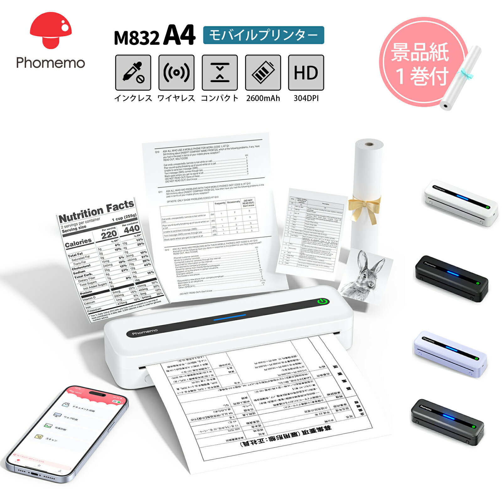 【レビュー特典】サーマルプリンター A4幅 モバイルプリンター 小型プリンター スマホ対応 Phomemo M832 感熱プリンター ビジネス向け 幅53/80/110mm/A4 HD 304dpi 携帯プリンター モノクロ印刷 充電式 PDF Word Excel対応 出張 旅行に適用