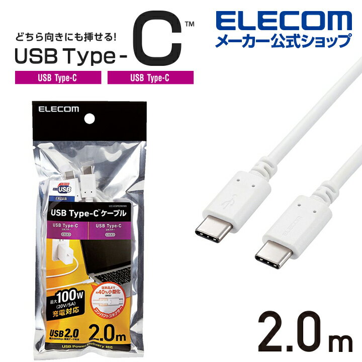 エレコム USB2.0ケーブル C-Cタイプ USB2.0ケーブル USB Type-C(TM) to USB Type-C(TM) 認証品 USB Power Delivery対応 5A出力 100W 高速充電 コンパクトコネクタ 2.0m ホワイト ELECOM U2C-CC5PC20NWH