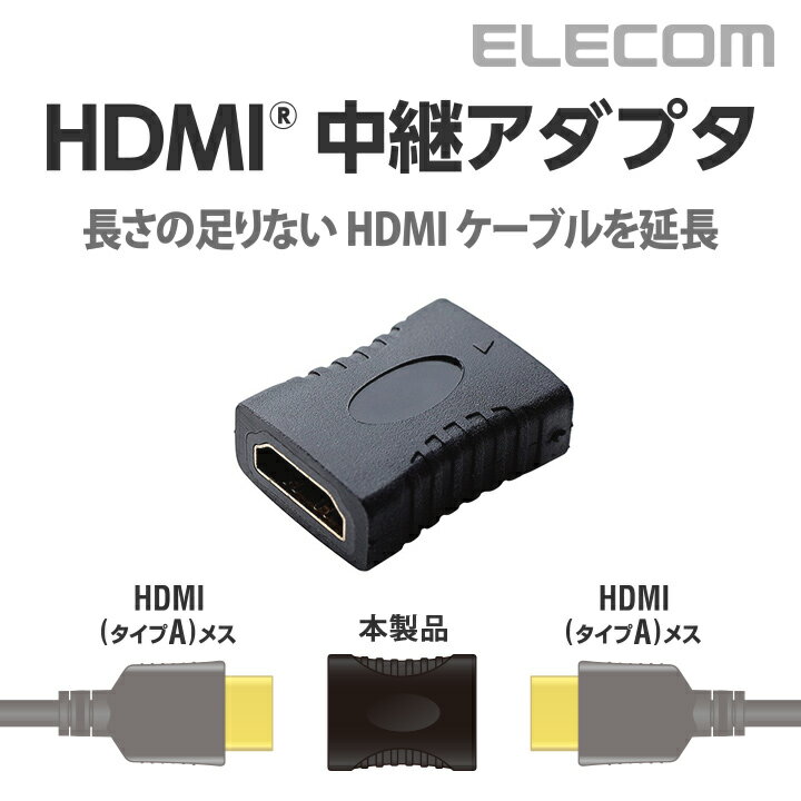 ■お手持ちのHDMI(R)ケーブルを延長できる!長さ5mまで中継可能なHDMI端子(タイプA)中継アダプタ。■HDMIケーブルどうしを接続し、延長する中継アダプターです。 ■短いHDMIケーブルどうしを接続し、最大5mまで延長することが可能です。※本製品はリピーター機能非搭載です。ケーブル総延長が5mを超えないよう接続してください。また、接続するケーブルの仕様によって映像が正常に映らない場合がございます。 ■交換が難しい場合でも手軽にケーブルを延長することができます。 ■4K×2Kの解像度に対応しております。※接続するケーブルの仕様によっては解像度が落ちる場合がございます。 ■サビなどに強く信号劣化を抑える金メッキプラグを採用しています。 ■EUの「RoHS指令(電気・電子機器に対する特定有害物質の使用制限)」に準拠(10物質)しています。 ■当製品はIC非搭載のパッシブタイプです。■コネクタ形状:HDMI(タイプA)メス-HDMI(タイプA)メス■カラー:ブラック■対応解像度:4K×2K(60p)対応 ※接続するケーブルの仕様によっては解像度が落ちたり映像が正常に映らなかったりする場合があります。エレコムダイレクトショップお手持ちのHDMIケーブルを延長できる!長さ5mまで中継可能なHDMI端子(タイプA)中継アダプタ。HDMIケーブルを延長できる中継アダプタHDMIケーブルどうしを接続し、延長する中継アダプタです。最大5mまで延長することが可能短いHDMIケーブルどうしを接続し、最大5mまで延長することが可能です。※本製品はリピーター機能非搭載です。ケーブル総延長が5mを超えないよう接続してください。手軽にケーブルを延長交換が難しい場合でも手軽にケーブルを延長することができます。金メッキプラグを採用サビなどに強く信号劣化を抑える金メッキプラグを採用しています。EU RoHS指令準拠EUの「RoHS指令(電気・電子機器に対する特定有害物質の使用制限)」に準拠しています。