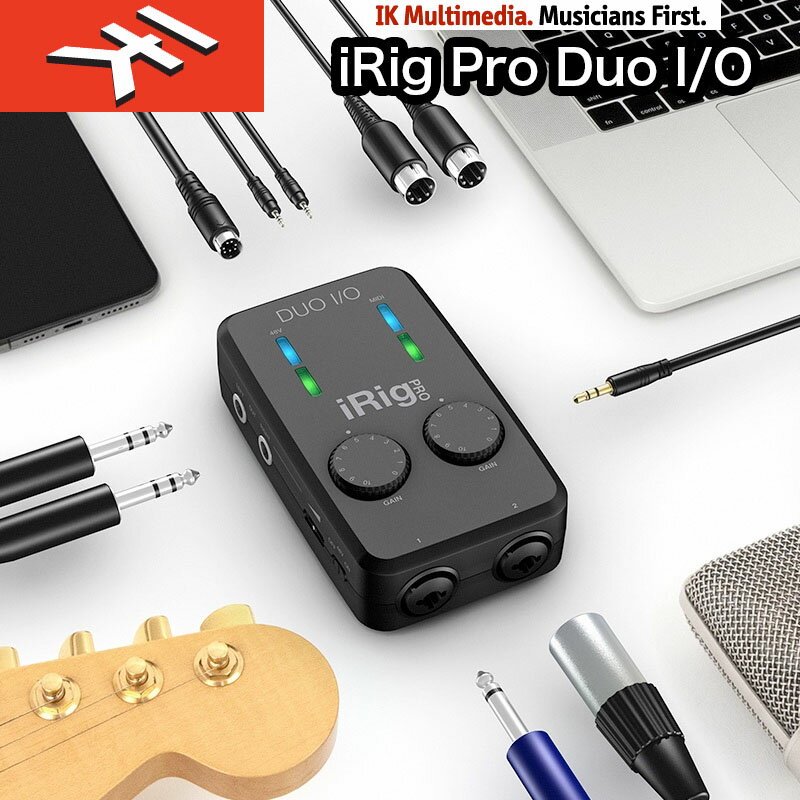・iPhone、iPad、Android、Mac/Windows PCなど幅広くお使いいただけるデュアル入力のモバイルオーディオインターフェイス・2系統のファンタム電源対応XLR/標準コンボ入力端子・改良されたゲインステージを備えたクラスAマイクプリアンプ・2系統の1/4インチ標準バランスアウト端子・ヘッドフォン端子(ダイレクトモニター機能付き)・MIDI IN / OUT端子(2本のMIDI端子ケーブルが付属)・エルゴノミクス(人間工学)に基づく理想的なデザイン・単三乾電池2本、USBバスパワー、ACアダプターによる給電(ACアダプターは付属していません)・外出先でも安心して使えるゴム仕様の表面仕上げ・Lightning、USB-C、USB-Aの3種類のケーブルが付属・デザインから製造まで一貫して、イタリア生産〇iRig Pro Duo I/Oの主な仕様【マイクインプット】- マイクイン:バランスタイプXLR×2(2番ホット)- 入力レベル:6 mVpp 〜 1.4 Vpp- 入力インピーダンス:3.2 kΩ- ゲイン幅:50 dB- ファンタム電源:+48 V ±4 V- 周波数特性: 20 Hz〜20 kHz(±1.5 dB)- 入力ノイズ::-103 dB (A)、-97 dB RMS【インストゥルメントインプット】- インストゥルメントイン:Hi-ZアンバランスタイプTS×2(標準フォーン)- 入力レベル:30 mVpp 〜 6.9 Vpp- 入力インピーダンス:1 MΩ- ゲイン幅:27dB- 周波数特性:2 Hz〜21 kHz(-3dB)@最少ゲイン、5 Hz〜21 kHz(-3dB)@最大ゲイン- 入力ノイズ::-104 dB (A) @最少ゲイン、-102 dB (A) @最大ゲイン【ラインアウトプット】- ラインアウト:バランスタイプTRS×2(標準フォーン)- フローティングバランス:アンバランス動作時に自動レベル補正- 最大出力レベル:+16 dBu(600 Ωバランス負荷時)- 周波数特性:10 Hz〜21 kHz(-3dB)- 出力ダイナミックレンジ:106 dB (A)- 出力インピーダンス:150 Ω(バランス時)【共通部】- AD/DA変換:24ビット- サンプリングレイト:44.1kHz/48kHz- 電源:USBバスパワー、乾電池(単三乾電池×2)またはACアダプター(9 VDC/500 mA、センターマイナス、別売 = IK Multimedia iRig PSU 9175をお勧めします)*モバイルデバイスで使用する場合は、乾電池またはACアダプターの仕様が必須です。- メーター:マルチカラーLED- 外形寸法:75×127×37 mm- 本体重量:197.2 g(バッテリーを除く)- 電池寿命:最大負荷録音時* - 3.5時間(ニッケル水素充電池)、45分(アルカリ乾電池)最少負荷再生時** - 10時間(ニッケル水素充電池)、3時間(アルカリ乾電池)*2つの入力で1.5 mAのファンタム電源使用、最大入力ゲイン、最大出力**音楽再生、ファンタム電源未使用○iRig Pro Duo I/Oの動作環境・iOSデバイスiPhone XS Max、iPhone XS、iPhone XR、iPhone X、iPhone 8 Plus、iPhone 8、iPhone 7 Plus、iPhone 7、iPhone SE、iPhone 6s Plus、iPhone 6s、iPhone 6 Plus、iPhone 6、iPhone 5s、iPad Pro (10.5インチ)、iPad Pro(12.9インチ・第2世代)、iPad Pro(9.7インチ)、iPad Pro(12.9インチ・第1世代)、iPad Air 2、iPad Air、iPad mini 4、iPad mini 3、iPad mini 2、iPad(第6世代)、iPad(第5世代)、iPod touch (第6世代)、iOS 7.0以上・MacintoshコンピューターMac OS X 10.6以降、空きUSBポート・Windowsコンピューター空きUSBポート、低レーテンシーのためにIK Multimedia開発のiRigオーディオドライバーのインストール必須・AndroidデバイスAndroid 5以降が動作し、USBデジタルオーディオ機能を搭載しているモデル○iRig Pro Duo I/Oの製品概要と主な特長iRig Pro Duo I/Oは、iPhone、iPad、Android(USBデジタルオーディオ対応機種)、Mac/Windowsコンピューターで使用できる、2 イン/2 アウトのオーディオ/MIDIインターフェイスです。ポケットに収まる小さなボディに、ファンタム電源対応のXLR/標準コンボ入力端子が2つ装備されているので、ギター/ベースなどのハイインピーダンスの楽器、ラインレベルの楽器、コンデンサーマイクの接続にも対応し、2チャンネルの同時録音が可能です。さらに、キーボードやコントローラーを接続できるMIDI イン/アウトも装備されています。音楽制作、ライブレコーディング、ストリーミング配信まで、幅広い場面でお使いいただけ、接続するデバイスも選びません。人気だった先代モデル、iRig Pro Duoに比べて内部回路も改良され、外観もゴム塗装による仕上げになりました。またゲイン調整用のノブも形状を変更し、操作しやすく改良されました。なお、Windows環境用に専用のドライバーも用意されます。IK Multimediaのご自身のアカウントに登録すると、AmpliTube 4、T-RackS Singlesの9モジュール、Mic Room、SampleTank 4 SEなどのコンピューター用プラグイン、音源ソフトウェアが登録アカウントに無償で追加されます。また、無償のiPhone/iPadアプリのAmpliTube CSにて有償版同等の36モデルが、SampleTank CSにて48音色が、VocaLiveにてMic Roomのマイクモデルがアンロックされるなどの特典も付いています。なんと付属のソフトウェア、iOSアプリのライセンスの総額は6万円相当です。