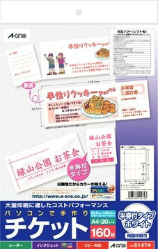 エーワン A-ONE 51474 パソコンで手作りチケット A4 8面 半券付 白◆入数:20シート(160枚) ◆シートサイズ:A4判 (210×297mm) ◆一片サイズ:52.5mm×148.5mm ◆面付:8面 4列×2段 ◆厚み:105g/m2(0.12mm) ◆用紙特性:マット両面印刷◆各種プリンタ兼用いろいろなプリンタで印刷できるチケット用紙です。ミシン目部分を山折り谷折りするだけで切り離せるマイクロミシンカットタイプです。代表的なチケット用紙に出来るだけ近い厚みの紙を使用しています。いろいろなプリンタで印刷できるチケット用紙です。ミシン目部分を山折り谷折りするだけで切り離せるマイクロミシンカットタイプです。代表的なチケット用紙に出来るだけ近い厚みの紙を使用しています。顔料インクでは、表面素材の特性上、インクが乾きにくいので、 印刷面にはできるだけ触れないようにしてください。