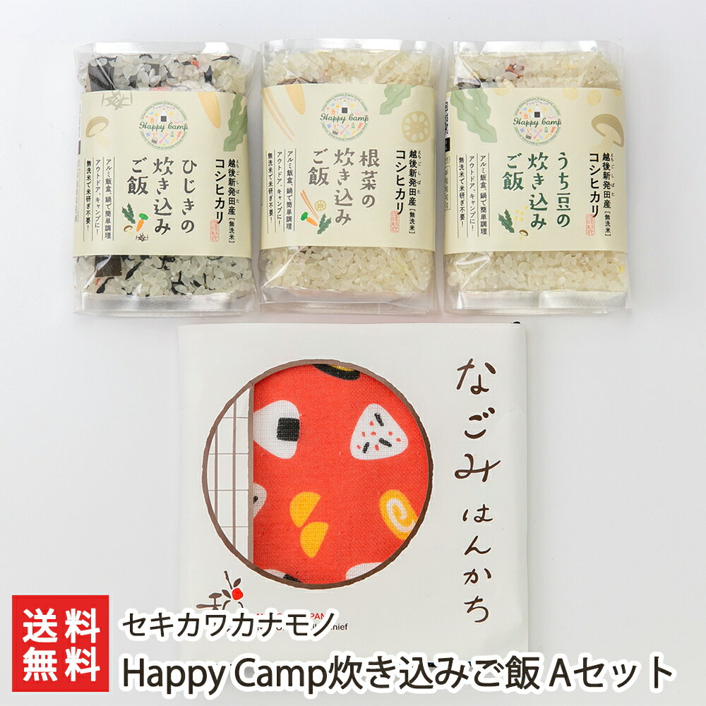 Happy Camp炊き込みご飯 Aセット ハンカチ付き(ひじきの炊き込みご飯、根菜の炊き込みご飯、打ち豆の炊き込みご飯各1袋、ハンカチ付き)セキカワカナモノ 新潟県産 コシヒカリ アウトドア キャンプ 新潟県 生産者直送 お取り寄せ ギフト プレゼント 贈り物 送料無料