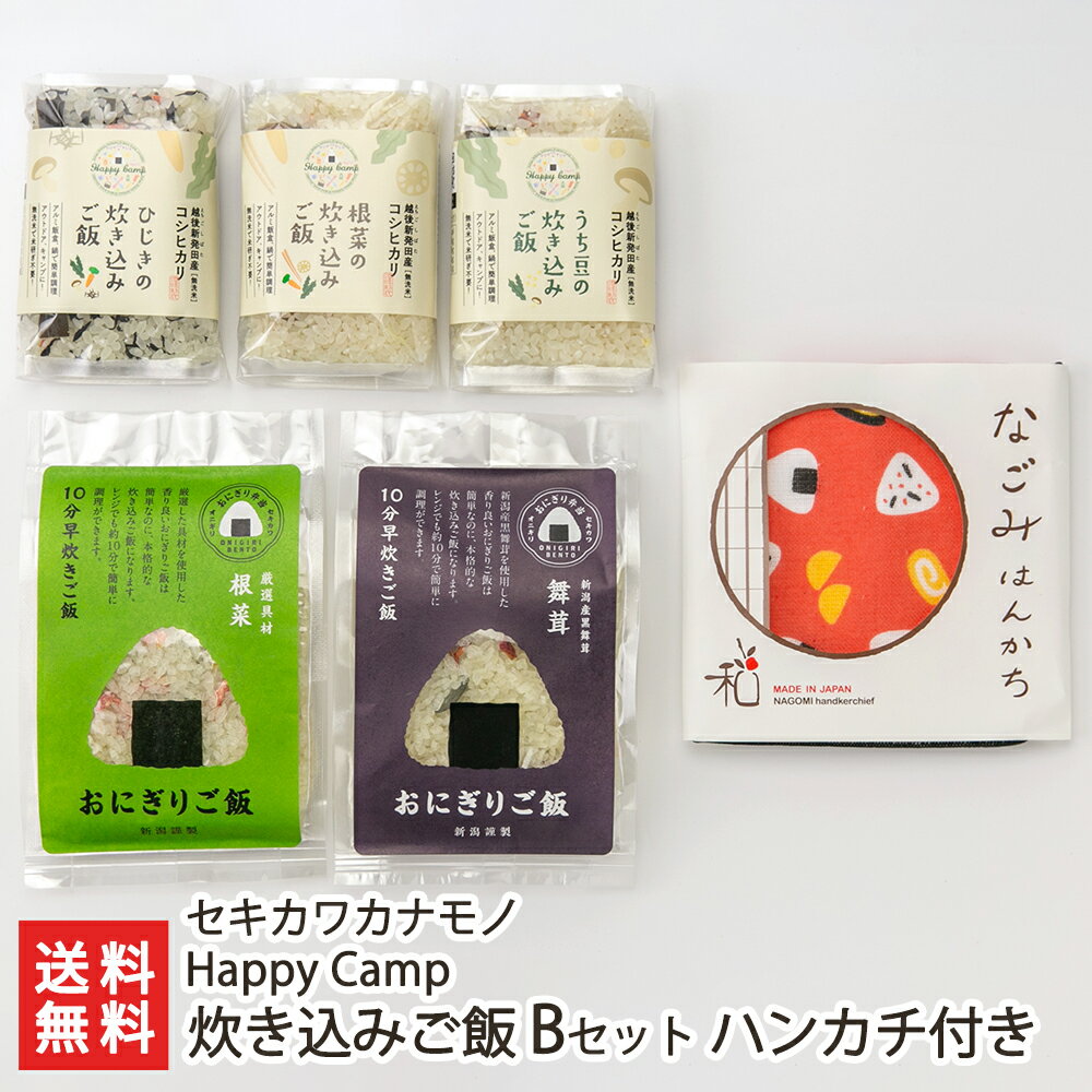 Happy Camp炊き込みご飯 Bセット ハンカチ付き(炊き込みご飯:ひじき,根菜,打ち豆,おにぎりご飯:根菜,舞茸各1袋、ハンカチ付き)セキカワカナモノ コシヒカリ アウトドア キャンプ 新潟県 生産者直送 お取り寄せ ギフト プレゼント 贈り物 送料無料