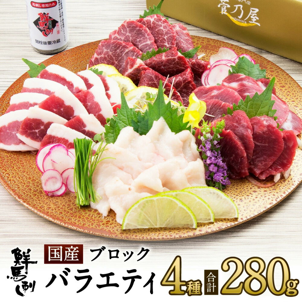 お歳暮 ギフト プレゼント 馬刺し 国産 ブロック4種バラエティセット 計280g 約7人前 (上霜降り80g 上赤身80g フタエゴ80g スライスコウネ40g) 熊本 直送 ばさし 馬肉 馬刺 菅乃屋 贈り物 お祝い 内祝い 誕生日 御歳暮