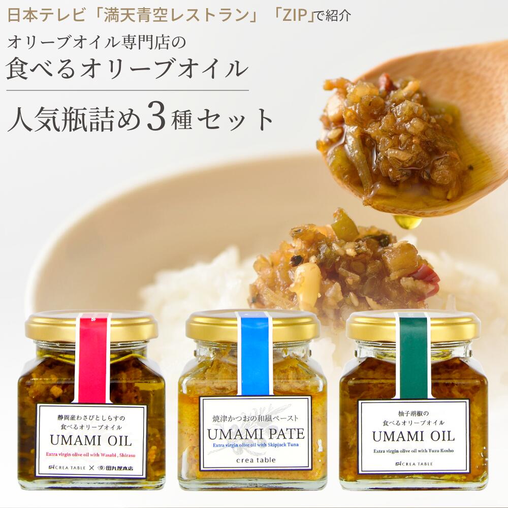 crea farm 食べるオリーブオイル 3種 バラエティセット 120g×3個 ご飯のお供 おつまみ 万能調味料 珍味 瓶詰め わさびとしらす 柚子胡椒 焼津かつおの和風パテ