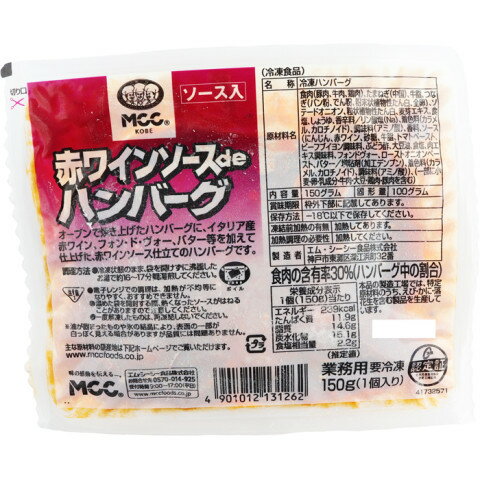 【冷凍】 オーブンで焼き上げたハンバーグに、イタリア産赤ワイン、フォン・ド・ヴォー、バター等を加えて仕上げた、赤ワインソース仕立てのハンバーグです。 ※油が固まったものや氷の結晶により、表面の一部が白っぽく見える場合がありますが品質には問題ありません。 ※在庫以上の数量をご希望の場合は、お手数ですがご注文前に弊社までお電話にてご連絡頂きたくお願い申し上げます。 名称MCC 赤ワインソースdeハンバーグ 150g商品番号x05011058001メーカーMCC 愛知県名古屋市西区名駅3丁目6−20販売単位個保存方法冷凍賞味期限パッケージに記載規格(内容量)150g(固形量100g)最終加工地日本(主原産地は異なる場合がございます。)ケース入数20個調理方法冷凍状態のまま、袋を開けずに沸騰したお湯で約16〜17分間湯煎してください。 ※電子レンジでの調理は、加熱が不均等になりやすく、おすすめできません。原材料食肉(豚肉、牛肉、鶏肉)、たまねぎ(中国)、牛脂、つなぎ(パン粉、でん粉、粉末状植物性たん白、全卵)、ソテードオニオン、粒状植物性たん白、麦芽エキス、食塩、しょうゆ、香辛料/リン酸塩(Na)、着色料(カラメル、カロチノイド)、調味料(アミノ酸)、香料、ソース(にんじん、赤ワイン、砂糖、牛脂、トマトペースト、ビーフブイヨン調味料、ぶどう酢、大豆油、食塩、肉エキス調味料、フォンドヴォー、ローストオニオンペースト、バター/増粘剤(加工デンプン)、着色料(カラメル、カロチノイド)、調味料(アミノ酸))、(一部に小麦・卵・乳成分・牛肉・大豆・鶏肉・豚肉を含む)アレルギー小麦・卵・乳成分・牛肉・大豆・鶏肉・豚肉 ※本品の製造工場では、特定原材料のうち、えび・かに・落花生を含む製品を生産しています。添加物表示リン酸塩(Na)、増粘剤(加工デンプン)、着色料(カラメル、カロチノイド)、調味料(アミノ酸)※ご注意【免責】アミカネットショップでは、最新の商品情報をサイト上に表示するよう努めておりますが、メーカーの都合等により、商品規格・仕様(容量、パッケージ、原材料、原産国等)が変更される場合がございます。このため、実際にお届けする商品とサイト上の表記が異なる場合がございますので、ご使用前には必ずお届けした商品の商品ラベルや注意書きをご確認ください。さらに詳細な商品情報が必要な場合は、メーカー等にお問い合わせください。画像はイメージとなります。実際にお届けする商品とパッケージ等が異なる場合がございますので、予めご了承ください。
