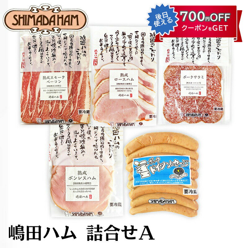 お歳暮 嶋田ハム 詰合せAセット(ssh-a) 5種詰め合わせ(ポークソーセージ 200g、熟成ボンレスハム 90g。熟成スモークベーコン 70g、熟成ロースハム 60g、ポークサラミ 50g) 保存料、着色料不使用 スパイスの配合30種類以上 冬ギフト