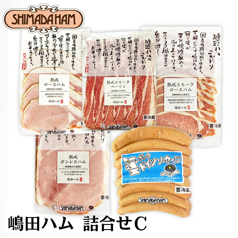 お歳暮 嶋田ハム 詰合せCセット(ssh-c)5種詰合せ(ポークソーセージ 200g、熟成ロースハム 60g、熟成スモークベーコン 70g、熟成スモークロースハム 120g、熟成ボンレスハム 140g) 保存料、着色料不使用 スパイスの配合30種類以上 冬ギフト