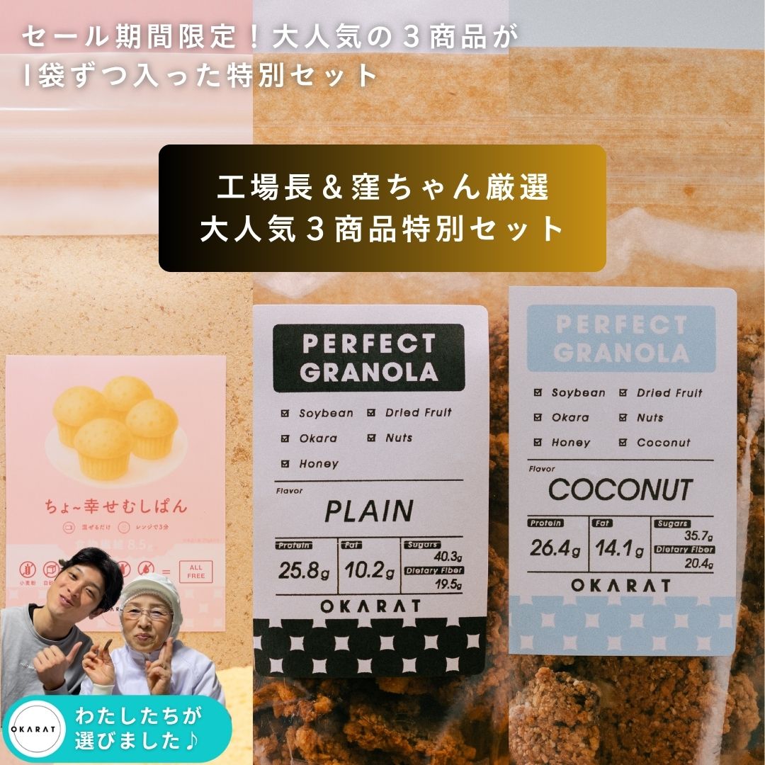 【OKARAT】『BLACK FRIDAY 期間限定セット』|PERFECT GRANOLA プレーン味100g(約2食分)・PERFECT GRANOLA ココナッツ味100g(約2食分)・ちょ~幸せむしぱん200g(約8食分)