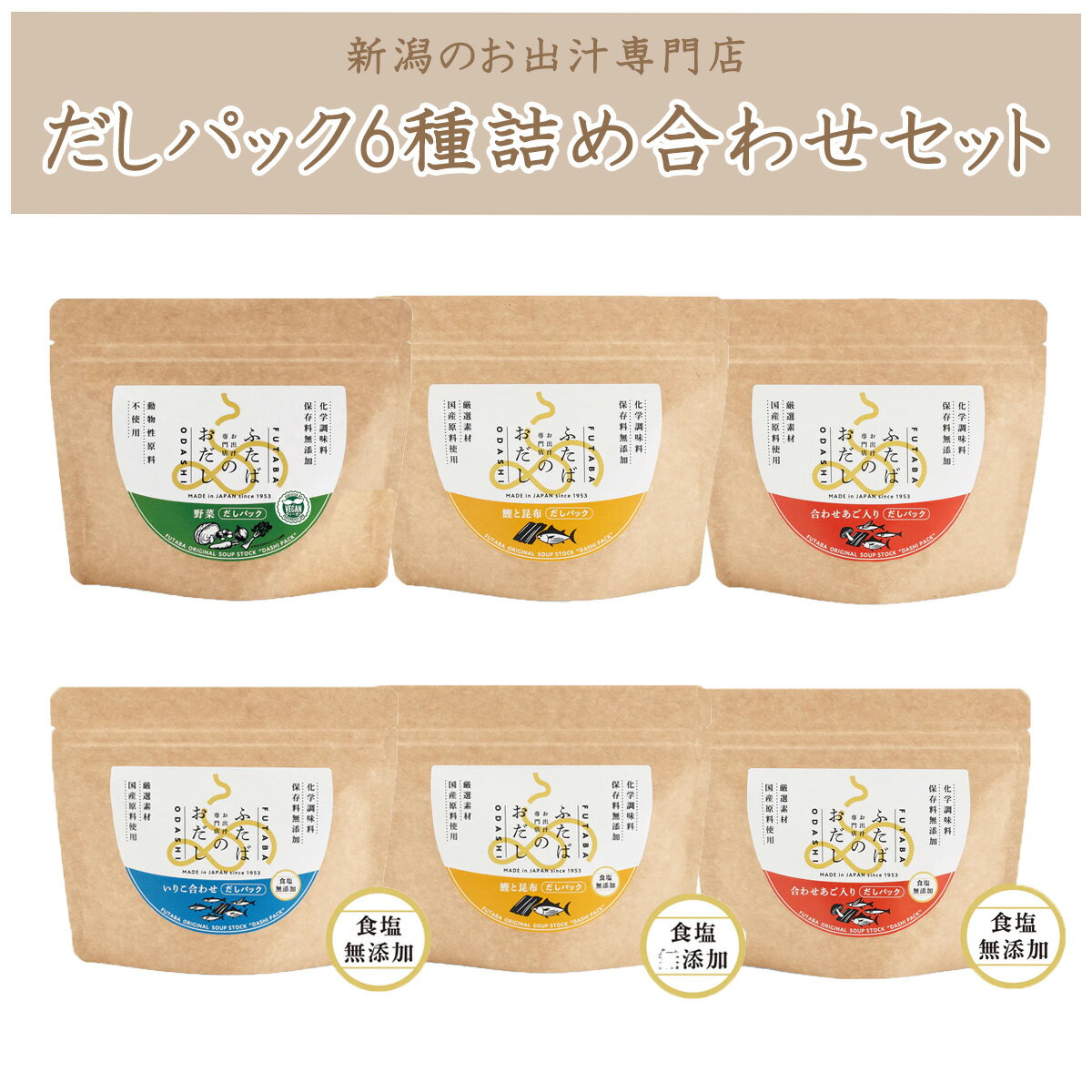 無添加だしパック(小) 6種詰め合わせセット 新潟の出汁専門店が作ったおだしふたばのおだし フタバ 調味料 野菜 ヴィーガン かつお 昆布 いわし 煮干し あご 椎茸 食塩無添加 国産 出産 結婚 祝い ギフト 天然素材 味噌汁 和食 煮物 おでん つゆ 送料 無料