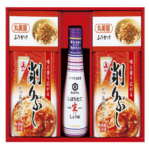 ●紙袋のご用意はできません。●ギフト商品のため納品書は同梱されません。●ご注文者様宛以外へ発送の場合、お届け先様の転居・住所不明・長期不在などが発生した際は商品をご依頼主様へ転送させていただきます。キッコーマンのしぼりたて生しょうゆをはじめ、伯方の塩・丸美屋のふりかけなどバラエティ豊かに詰合せました。■キッコーマンしぼりたて生しょうゆ200ml・丸美屋ふりかけ5種(さけ風味・しそ風味・かつお風味・たまご・たらこ風味)×2・かつお削り節(3g×4袋)×2 【卵・乳成分・小麦・えび】 ■箱サイズ:200×300×65mm【用途】引出物 結婚内祝 婚家 結婚祝 出産内祝 出産祝 仏事 快気 新築 記念 贈答 お返し お祝い 御祝 香典返し 法事 法要 引越し 新築祝い お中元 お歳暮 敬老の日 還暦 賀寿 母の日 父の日 自分へのご褒美 自分へのお取り寄せグルメなど 快気祝い 成人お祝い 金婚式 銀婚式 入籍記念日 白寿 卒寿 米寿 傘寿 喜寿 古希 還暦祝い 賀寿 長寿祝い 緑寿 入園祝い 入学祝い 卒業祝い 就職祝い 新築祝い 開店祝い お土産 お誕生日プレゼント お年賀 お中元ギフト 残暑見舞い●紙袋のご用意はできません。 ●ギフト商品のため納品書は同梱されません。 ●ご注文者様宛以外へ発送の場合 お届け先様の転居・住所不明・長期不在などが発生した際は 商品をご依頼主様へ転送させていただきます。