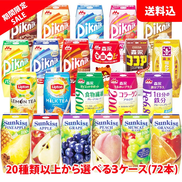 【スーパーSALE限定】【エントリーでポイント10倍】送料無料 森永 ブリック 200ml 3ケース(72本) ケースで選べる サンキスト Sunkist ピクニック Piknik リプトン ココア マミー 紙パック ジュース 森永乳業