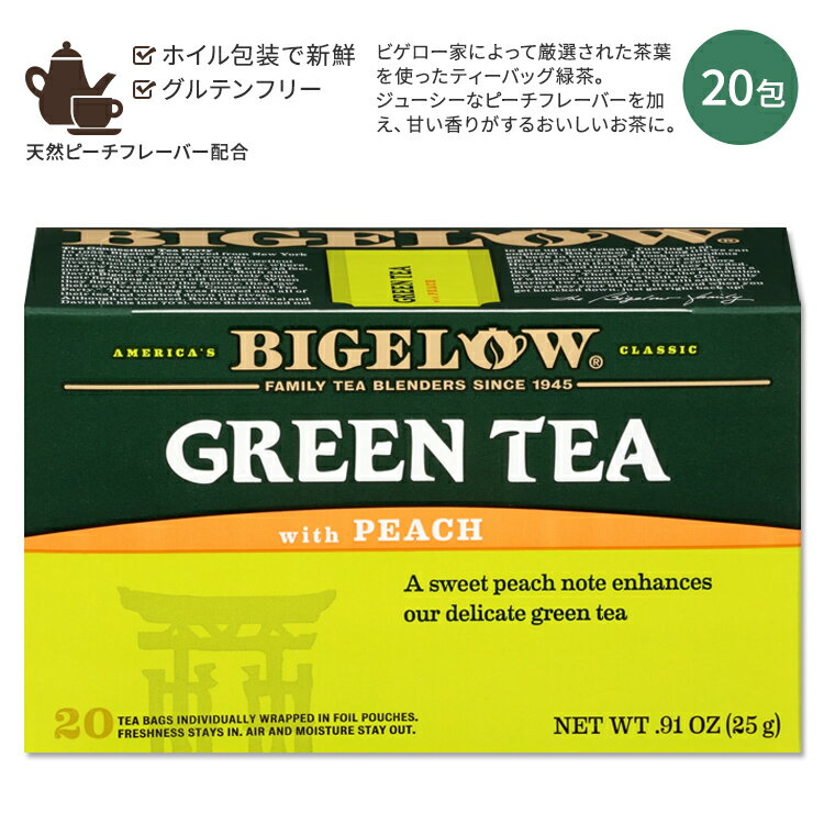 【最大2000円OFFクーポン】【隠れた名品】ビゲロー グリーンティー ピーチ入り 20包 25g (0.91oz) BIGELOW Green Tea with Peach Caffeinated 緑茶 ティーバッグ 桃 フレーバー ホット アイス 手摘み 茶葉 フルーツ 果実