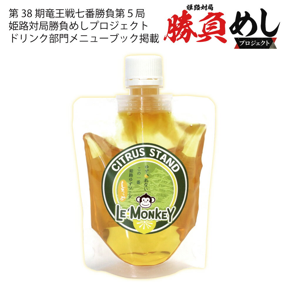 ・第38期竜王戦七番勝負第5局 姫路対局勝負めしプロジェクト ドリンク部門メニューブック掲載品 ・2025年11月1~2日 姫路城三の丸広場で開催の「人間将棋 姫路の陣」にも出店しました。 姫路城のおみやげ、姫路土産としてオススメします。 すっきりとした甘酸っぱさと爽やかなゆずの香り「姫路ゆずソーダ」の原液シロップです。 5~8倍希釈でお召し上がりください。 夏はゆずソーダにゆずネード、冬はホットゆず・かき氷にアイス、焼き菓子やケーキシロップにお使いいただけます。 国産素材・無添加にこだわった天然果汁100%のゆずシロップです。 名称:ゆずシロップ 原材料:姫路安富ゆず・兵庫県産はちみつ・国産砂糖 栄養成分表示(100ml当たり):熱量245kcal、たんぱく質0.2g、脂質0.04g、炭水化物63.9g、食塩相当量0g 内容量:200g 賞味期限:製造から6か月(裏面に賞味期限を記載) 保存方法:直射日光を避け涼しいところで保存 ※開封後は要冷蔵。お早めにお召し上がりください。 販売者:シトラスStandレ・モンキー 兵庫県姫路市飯田3-102 製造所:農事組合法人安富ゆず組合 兵庫県姫路市安富町長野320-1