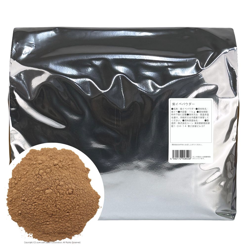 紫イぺは、タヒボ、paudarco barkパウダルコバーク(パウデアルコバーク)などと呼ばれ、ノウゼンカヅラ科で南米アマゾンの熱帯雨林に自生しており、10〜20mもある大きな樹木で紫色の花を咲かせます。アマゾンの先住民はこの内部樹皮を煎じたものを紫イペ茶として愛飲し、現地ではタジ(tajy)(活力をみなぎらせるという意味)と呼んでいます。 近年、紫イペの研究が進み、樹皮に含まれるラパコールという物質が注目を浴びています。 そのままお湯などに混ぜてお召し上がり下さい。 1日3g程度の摂取をオススメします。 紫イペパウダー100g当たり エネルギー 356Kcal たんぱく質 3.6g 炭水化物 82.7g 脂質 1.2g ナトリウム 3mg 水分 5.2g 灰分 7.3g 原材料:紫イペバークパウダー100%(IPE ROXO POWDER)(粒度60メッシュ) 学 名:Tabebuia avellanedae lor 原産国:ブラジル 使用部位:樹皮 内容量:業務用1Kg 賞味期限:別途商品ラベルに記載(約3年) 保存方法:高温多湿を避け、日光の当たらない冷暗所 または冷蔵庫で保管してください。 パッケージサイズ:チャック付アルミスタンド袋 120×170(140)×55mm