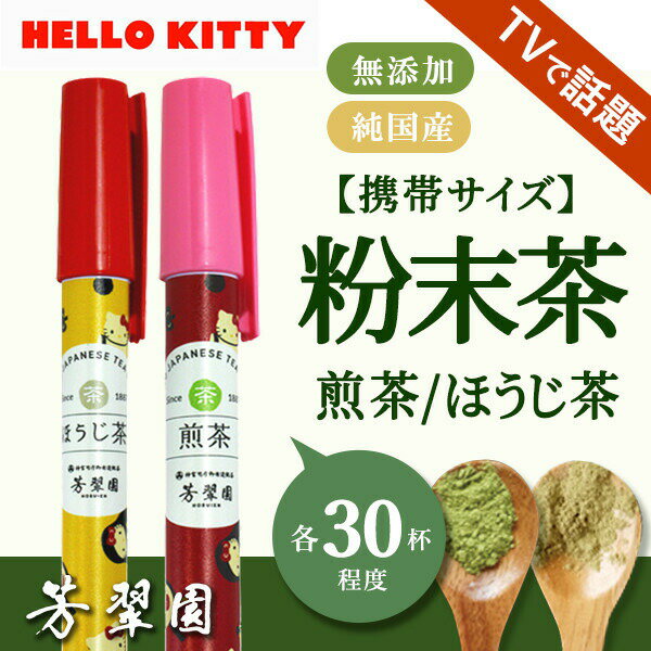 メディア掲載情報 FMヨコハマ NIPPON CHA・茶・CHA 2017年4月8日 盛り上がる日本茶シーンのフロンティア、FMヨコハマ(84.7MHz)のNIPPON CHA・茶・CHA!DJは若き日本茶伝道師の茂木雅世さん。3週連続でご紹介いただいてます!今回は、粉末の日本茶が入ったペン お手軽粉末茶ペンを取り上げていただきました。香りがいいとのコメントありがとうございます!水にも溶けるので、ちょっとお茶が飲みたいときに便利。濃いのがお好みの方は多めに入れて調節できますよ!湯呑みサイズだと30杯前後作れます。ラインナップは煎茶,ほうじ茶,煎茶&ほうじ茶。お得な詰め替え用はもちろん、かわいいハローキティのデザインもありますよ★ CREA 2016年8月号 良いモノ、良い場所、良い暮らし 美味しい!楽しい!心ときめくスポット&プロダクト いいところどり 大人気の[お手軽粉末茶ペン]に、サンリオのハローキティバージョンが登場! 内容にもこだわりが。味も香りも優れる芳翠園の上質茶葉(急須で淹れる用の茶葉です!)を粉末化。 無添加の一番茶なので、そのまま食べてもおいしい茶葉なのです。 学校・オフィスでそばに置きたくなる、かわいいハローキティのパッケージ! ペットボトルの水だけあれば、どこでも本格的な煎茶とほうじ茶を楽しめます。 ギフトにも自分用にも最適な一品です。 ほか、スイーツにかけたり、お塩と混ぜたり、焼酎にもいけちゃいます。 お客様の中には、粉だけで召し上がる猛者も…! 楽しみ方は自由。 カバンに、ポケットに、携帯可能なコンパクトサイズ。 お供にいかがでしょうか? [内容量]粉末煎茶・ほうじ茶 各7g ※時期によってパッケージが変更される可能性がございます。 商品仕様 項目 内容 名称 粉末茶 原材料 茶(国産) 内容量 煎茶(粉末) ほうじ茶(粉末) 各7g 賞味期限 包装日より約8か月 保存方法 高温多湿を避けて保存お願いいたします。移り香にご注意ください。長期保存の場合は、ジップロックに入れて冷凍庫にて保存して頂けると、美味しさが保たれます。 製造元 株式会社老松園三重県松阪市 販売者 株式会社芳翠園東京都品川区大崎3-10-13-103 ⓒ 1976, 2018 SANRIO CO.,LTD. APPROVAL NO. S592796※こちらの商品は掛け紙は承れませんのでご了承下さい。