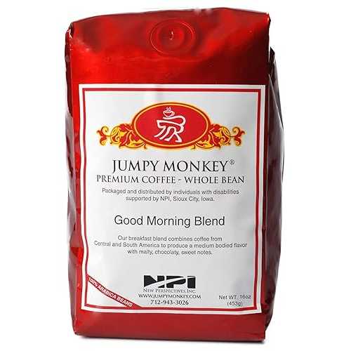 ジャンピー モンキー コーヒー グッドモーニング ブレンド - ミディアム ダーク ロースト、100% アラビカ種、全粒コーヒー、水出し、フレンチ プレス、エスプレッソ マシン用、16 オンス バッグ Jumpy Monkey Coffee Good Morning Blend - Medium Dar