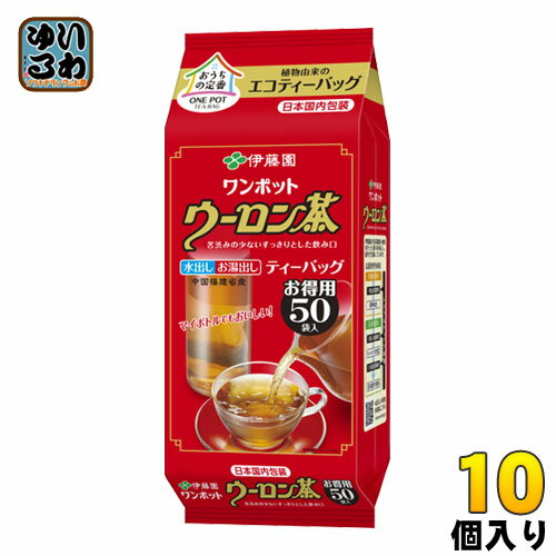 【一個あたり 477円(税込)】【賞味期間】製造後13ヶ月【商品説明】甘い香りの「色種(しきしゅ)」を使用。香り良く、苦味の少ない後味のすっきりとした味わいに仕上げました。植物由来の生分解性フィルターを採用した、環境にやさしいエコティーバッグです。【名称および品名】烏龍茶ティーバッグ【原材料】茶(半発酵茶)【保存方法】常温【製造者、販売者、又は輸入者】株式会社伊藤園【変更事項】ページリニューアル日:2021/05/17変更内容:パッケージ、入数※北海道・沖縄県・離島(一部)へのお届けは決済時に送料無料となっていても追加送料が必要です。(コカ・コーラ直送を除く)北海道1個口 715円(税込)、沖縄県1個口 2420円(税込)※離島・一部地域は追加送料がかかる場合があります。追加送料の詳細は注文確定メールにてご案内いたします。※本商品はご注文タイミングやご注文内容によっては、購入履歴からのご注文キャンセル、修正を受け付けることができない場合がございます。変更・修正ができない場合は、メール、お電話にてご連絡をお願い致します。■ 法人・団体のお客様 大口購入のご相談承ります ■法人のお客様、各種団体のお客様で、まとまった数量でのご購入をご検討の際は、お気軽にご相談ください。お客様のご要望に合わせて柔軟に対応させていただきます。まずはお気軽にお問い合わせフォームよりご連絡ください。送料無料 お茶 おちゃ ティーバッグ エコ わんぽっと いとうえん 烏龍茶 ウーロンちゃ 水出し お湯出し おうちの定番 one pot マイボトルでもおいしい 50袋入 10個入 4901085605370