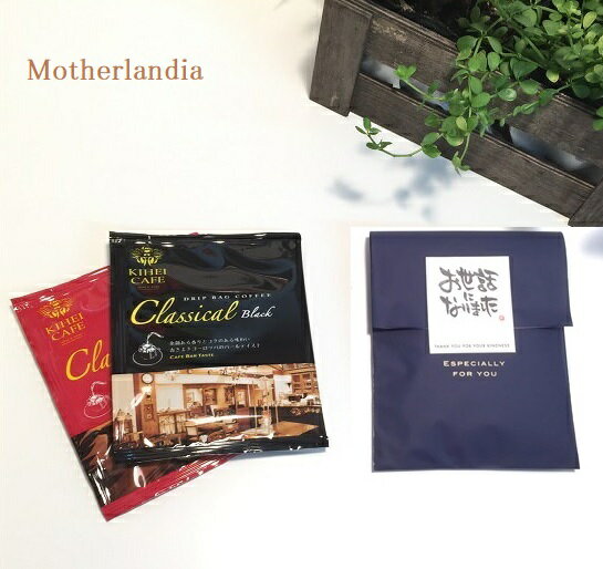 【この商品は次の用途に適しています♪】 出産内祝い 内祝いギフト 退職 お礼 内祝い ギフト 記念品 退職ご挨拶 引っ越しご挨拶 イベント記念品 結婚プチギフト おしゃれ 退職お礼の品 周年記念 プレゼント ギフト 粗品 メッセージシール ノベルティ 結婚内祝い 新築内祝い 快気祝 快気内祝い 引き出物 入学内祝い返礼 プレゼント プチギフト 退職挨拶 引っ越し挨拶2次会引き出物 卒業記念 周年記念品 大量 お配り 内祝いギフト 記念品 ブライダルプチギフト シンプル コーヒープチギフト コーヒーギフト ドリップコーヒー ドリップコーヒープチギフト プチギフトキット 和のプチギフト 日本茶ギフ 日本茶ティーバッグギフト ほうじ茶 桜茶 玄米茶 和のギフト コント・ド・フランス フレーバーティ クッキーギフト クッキープチギフト 焼き菓子 焼き菓子プチギフト プチクッキー コント・ド・フランス フレーバーティ 紅茶 紅茶プチギフト ティーバッグギフト 企業 法人 団体 学校 小学校 中学校 高校 幼稚園 保育園 創立 設立 周年 町内会 店舗 お店 開店挨拶ケアホーム 個人 事業主 個人経営 スクール 個人事業主 お祝い 祝賀会 社内行事 送別会 入社式 インターンシップ ギフト 感謝 お礼 表彰 表彰式 記念行事 周年記念 発表会 展示会 返礼 プレゼント プチギフト 引き出物 記念品 挨拶 ご挨拶 景品 参加賞 決起会 大量 お配り 内祝いギフト お礼 内祝い ギフト イベント記念品 イベント 卒業 式 入学 入園 おしゃれ ギフト 粗品メッセージシール ノベルティ 慰労会 バレエ発表会 教室 ピアノ発表会 退職のお礼に、ご挨拶に、感謝の気持ちをこめておつくりします。 「紅茶がお好みか、コーヒーがお好みかわからない」 また、「どちらも楽しんでいただきたい」・・ という場合にぴったりのマザーランディアならではのプチギフト! 湯布院長寿畑のコーヒーシリーズ。 1948年の創業以来、湯の町別府に拠点を置き、 半世紀以上に渡り、別府市で唯一の自家焙煎の コーヒーメーカーとして、地元の方に愛されてきました。 より一層みなさまにおいしくいただいていただくために 当店とKIHEICAFEで吟味したこだわりのドリップコーヒー。 高品質で鮮度の高いコーヒーを目指し KIHEICAFEクラシカルレッド、クラシカルブラックの 豆の品質と鮮度にこだわり、 コーヒーインストラクター1級焙煎士が 絶妙に焙煎し、お届けいたします。 ◆紅茶についてのご注意◆ 「アールグレイ」「アップル」「ストロベリー」 「ピーチ」の4種のうち、いずれか2種が入ります。 紅茶のご指定をいただきましても、ご希望には 添えませんことをご了承いただければ幸いです。 ◆仕様 ------------------------------------- ●コント・ド・フランス・ティーバッグ1袋 ------------------------------------- (4種よりアソート) 原産国:インド/内容量:2g 原材料:紅茶、香料 ------------------------------------- ●クラシカルレッドまたはクラシカルブラックx1p ------------------------------------- ・クラシカルブラック 品名:レギュラーコーヒー(粉) 原材料名:コーヒー豆 生豆生産国:ブラジル・グァテマラ・他 内容量:8g ・クラシカルレッド 品名:レギュラーコーヒー(粉) 原材料名:コーヒー豆 生豆生産国:ブラジル・コロンビア・他 内容量:8g ◆ラッピングサイズ ・PEバッグネイビー:約10x13cm ☆パソコンの環境、または撮影時の照明や フラッシュ等により、多少商品画像と色合いが 異なる場合がございます。 予めご了承のほどお願い申し上げます。 プチギフト ドリップコーヒー 1袋 珈琲 紅茶1袋 ティーバッグ フレーバーティ プレゼント 退職 ご挨拶 イベント 記念品 お配り お礼 メッセージシール 気持ちを伝えるプチギフト♪お見舞いのお礼・・退職のときのご挨拶・・周年記念に・・ ひかえめだけどしっかり気持ちをお伝えします。