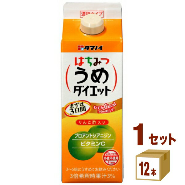 【名称】タマノイ酢 はちみつうめ ダイエット 濃縮タイプ500ml×12本×1ケース (12本)【商品詳細】さっぱりとしたりんご酢と爽やかなうめ果汁を使用。さらにはちみつをプラスすることで、ほどよい甘さで、毎日おいしく続けられる一品です。美容に嬉しいプロアントシアニジン(ポリフェノールの一種)も。【容量】500ml【入数】12【保存方法】7〜15度の温度が最適。高温多湿、直射日光を避け涼しい所に保管してください。【メーカー/輸入者】タマノ井酢【JAN】4902087156587【注意】ラベルやキャップシール等の色、デザインは変更となることがあります。またワインの場合、実際の商品の年代は画像と異なる場合があります。【商品につきまして】最新の商品情報を表示するよう努めておりますが、メーカーの都合により、商品規格・仕様(容量、パッケージ、原材料、原産国など)が変更される場合がございます。 このため、実際にお届けする商品とサイト上の商品情報の表記が異なる場合がございます。予めご了承ください。【送料につきまして】離島地域は、別途メールにて追加金額をご連絡いたします。【ご注文時のキャンセル・変更につきまして】ご注文確定メール配信後のキャンセル・変更は受け付けておりません。【発送につきまして】・商品によって発送元・配送業者が異なる場合がございます。予めご了承ください。 ・異なる受注番号の商品を同梱することは出来ません。 ・PPバンド、透明テープで補強しております ・お届け先の変更、営業所留め指定はできません。・長期不在、お届け先の誤入力などによって、商品が弊社に持ち戻りとなった場合につきましては、衛生上の観点から再発送を致しておりません。商品代金につきましては、お客様のご負担となりますのでご注意ください。【返品・交換・キャンセル・保証につきまして】食料品となりますので、不具合のない場合、未開封・未使用に限らず一切返品を受け付けておりません。万が一お届けした商品に不具合がございましたら、商品到着後7日以内にご連絡をお願いいたします。交換等の対応をさせていただきます。 ただし7日を過ぎたものは対応できませんのでご注意ください。 7日以内でも、商品を使用または廃棄した場合は対応できません。外箱の汚損・破れ、缶の傷・へこみ等の返品・交換はできかねます。【その他注意事項につきまして】・12時以降のご注文は翌営業日の対応となります。 ・領収書発行は、商品発送時にお送りしますメール内のURLより発行しダウンロードをお願いいたします。 ・後払い決済でのお支払いについては、お支払い時の控えが領収書の代わりとなります。・重複発行を避けるために弊社では領収書は発行できません。ご了承ください。お買い物パンダのお皿もれなくもらえる