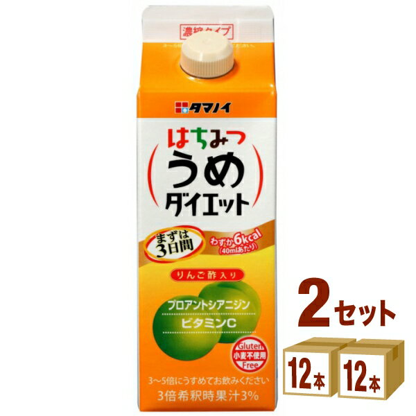 【名称】タマノイ酢 はちみつうめ ダイエット 濃縮タイプ500ml×12本×2ケース (24本)【商品詳細】さっぱりとしたりんご酢と爽やかなうめ果汁を使用。さらにはちみつをプラスすることで、ほどよい甘さで、毎日おいしく続けられる一品です。美容に嬉しいプロアントシアニジン(ポリフェノールの一種)も。【容量】500ml【入数】24【保存方法】7〜15度の温度が最適。高温多湿、直射日光を避け涼しい所に保管してください。【メーカー/輸入者】タマノ井酢【JAN】4902087156587【注意】ラベルやキャップシール等の色、デザインは変更となることがあります。またワインの場合、実際の商品の年代は画像と異なる場合があります。【商品につきまして】最新の商品情報を表示するよう努めておりますが、メーカーの都合により、商品規格・仕様(容量、パッケージ、原材料、原産国など)が変更される場合がございます。 このため、実際にお届けする商品とサイト上の商品情報の表記が異なる場合がございます。予めご了承ください。【送料につきまして】離島地域は、別途メールにて追加金額をご連絡いたします。【ご注文時のキャンセル・変更につきまして】ご注文確定メール配信後のキャンセル・変更は受け付けておりません。【発送につきまして】・商品によって発送元・配送業者が異なる場合がございます。予めご了承ください。 ・異なる受注番号の商品を同梱することは出来ません。 ・PPバンド、透明テープで補強しております ・お届け先の変更、営業所留め指定はできません。・長期不在、お届け先の誤入力などによって、商品が弊社に持ち戻りとなった場合につきましては、衛生上の観点から再発送を致しておりません。商品代金につきましては、お客様のご負担となりますのでご注意ください。【返品・交換・キャンセル・保証につきまして】食料品となりますので、不具合のない場合、未開封・未使用に限らず一切返品を受け付けておりません。万が一お届けした商品に不具合がございましたら、商品到着後7日以内にご連絡をお願いいたします。交換等の対応をさせていただきます。 ただし7日を過ぎたものは対応できませんのでご注意ください。 7日以内でも、商品を使用または廃棄した場合は対応できません。外箱の汚損・破れ、缶の傷・へこみ等の返品・交換はできかねます。【その他注意事項につきまして】・12時以降のご注文は翌営業日の対応となります。 ・領収書発行は、商品発送時にお送りしますメール内のURLより発行しダウンロードをお願いいたします。 ・後払い決済でのお支払いについては、お支払い時の控えが領収書の代わりとなります。・重複発行を避けるために弊社では領収書は発行できません。ご了承ください。お買い物パンダのお皿もれなくもらえる