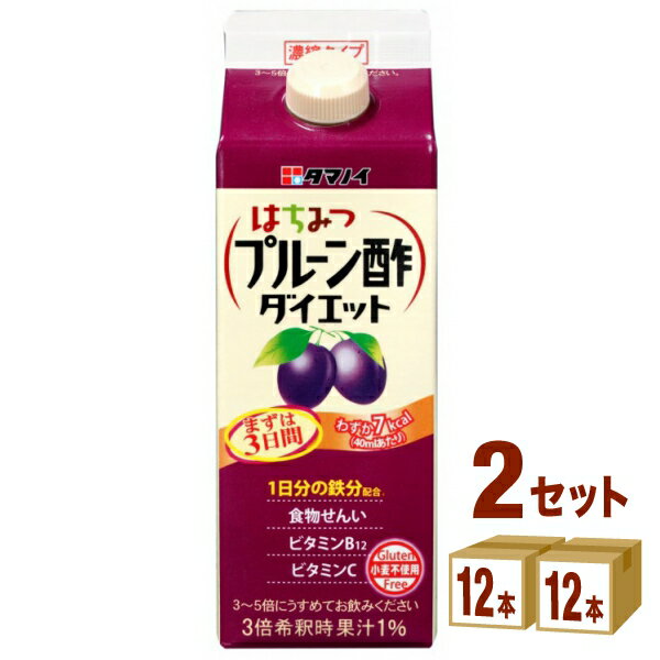 【名称】タマノイ酢 はちみつプルーン酢ダイエット 濃縮タイプ500ml×12本×2ケース (24本)【商品詳細】体に嬉しい鉄分とプルーン酢のおいしい組み合わせ。不足しがちな食物繊維やビタミン類も配合。毎日の健康を応援します。【容量】500ml【入数】24【保存方法】7〜15度の温度が最適。高温多湿、直射日光を避け涼しい所に保管してください。【メーカー/輸入者】タマノ井酢【JAN】4902087156570【注意】ラベルやキャップシール等の色、デザインは変更となることがあります。またワインの場合、実際の商品の年代は画像と異なる場合があります。【商品につきまして】最新の商品情報を表示するよう努めておりますが、メーカーの都合により、商品規格・仕様(容量、パッケージ、原材料、原産国など)が変更される場合がございます。 このため、実際にお届けする商品とサイト上の商品情報の表記が異なる場合がございます。予めご了承ください。【送料につきまして】離島地域は、別途メールにて追加金額をご連絡いたします。【ご注文時のキャンセル・変更につきまして】ご注文確定メール配信後のキャンセル・変更は受け付けておりません。【発送につきまして】・商品によって発送元・配送業者が異なる場合がございます。予めご了承ください。 ・異なる受注番号の商品を同梱することは出来ません。 ・PPバンド、透明テープで補強しております ・お届け先の変更、営業所留め指定はできません。・長期不在、お届け先の誤入力などによって、商品が弊社に持ち戻りとなった場合につきましては、衛生上の観点から再発送を致しておりません。商品代金につきましては、お客様のご負担となりますのでご注意ください。【返品・交換・キャンセル・保証につきまして】食料品となりますので、不具合のない場合、未開封・未使用に限らず一切返品を受け付けておりません。万が一お届けした商品に不具合がございましたら、商品到着後7日以内にご連絡をお願いいたします。交換等の対応をさせていただきます。 ただし7日を過ぎたものは対応できませんのでご注意ください。 7日以内でも、商品を使用または廃棄した場合は対応できません。外箱の汚損・破れ、缶の傷・へこみ等の返品・交換はできかねます。【その他注意事項につきまして】・12時以降のご注文は翌営業日の対応となります。 ・領収書発行は、商品発送時にお送りしますメール内のURLより発行しダウンロードをお願いいたします。 ・後払い決済でのお支払いについては、お支払い時の控えが領収書の代わりとなります。・重複発行を避けるために弊社では領収書は発行できません。ご了承ください。お買い物パンダのお皿もれなくもらえる