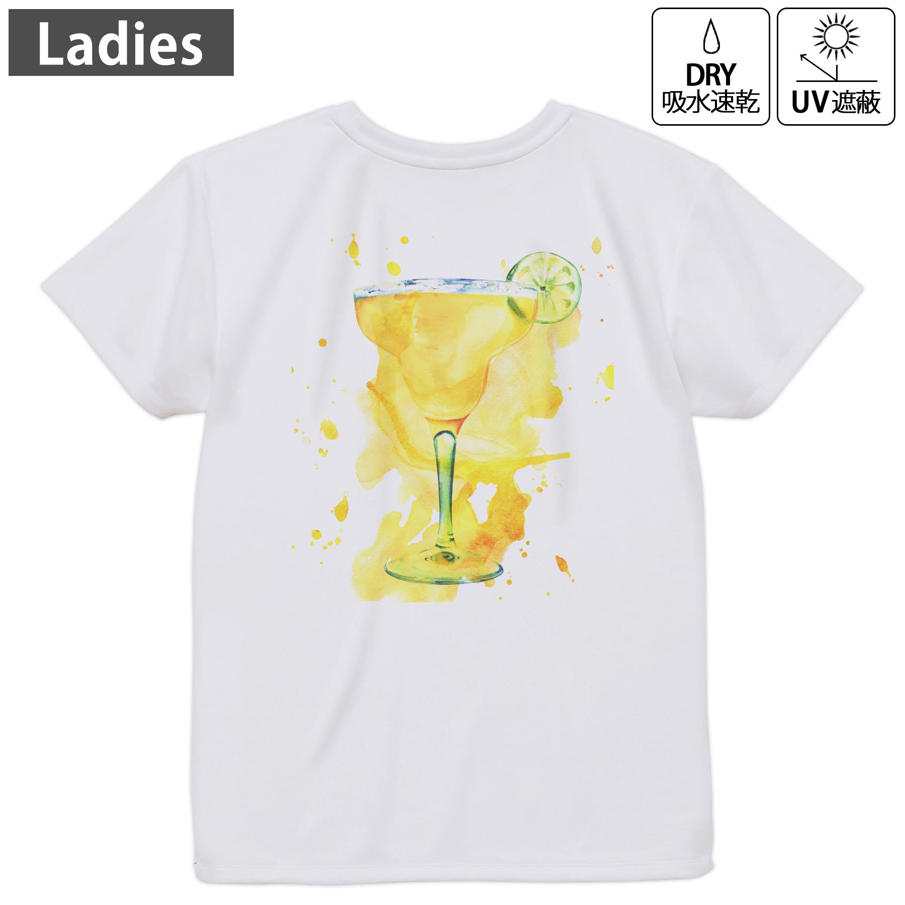 レディース ドライバックプリントTシャツ ホワイト 半袖 4.1オンス ジム トレーニング スポーツ 運動会 ドライアスレチック UVカット 紫外線遮蔽 吸水速乾 デザイン Tshirt M L 014587 カクテル お酒 黄色