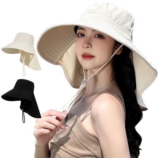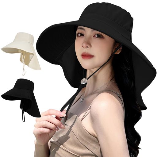 【9.5cm超つば広・全方位UVカット】最新昇級の9.5cm超つば広つきレディース日除け帽子。帽子のつば後ろは約22cmと長くて、360度全方位保護のため、顔から首元まで紫外線から守ってくれます。UPF50+、紫外線遮断率99.9%のUVカット帽子は、猛烈な直射日光から頭とお肌を守ります。日差しが強い日は、紫外線対策に熱中症の予防に効果的なuvカット帽子。 【首筋も爽やかに使え】通気性に優れた素材を採用しているレディース帽子。汗をかいてもさらっとした肌触りを保つことができ、頭に熱がこもらない完全遮光帽子。帽子の内側にも蒸れを軽減する汗止めバンドがついているので、暑い夏にぴったりのUVカット帽子。つば広と大きい日除け帽子は、頭周り55-60cmの方におすすめです。 【ポニーテール穴・あご紐付き】背面には縛った髪を出す穴があり、ポニーテールの女性におすすめです。首の後ろまでしっかり覆う一体型つば広帽子ですが、炎天下のアウトドアには紫外線対策できるレディース帽子。あご紐付きのレディース帽子は、頭周りのフィット感を調整でき、風に飛ばされにくい。