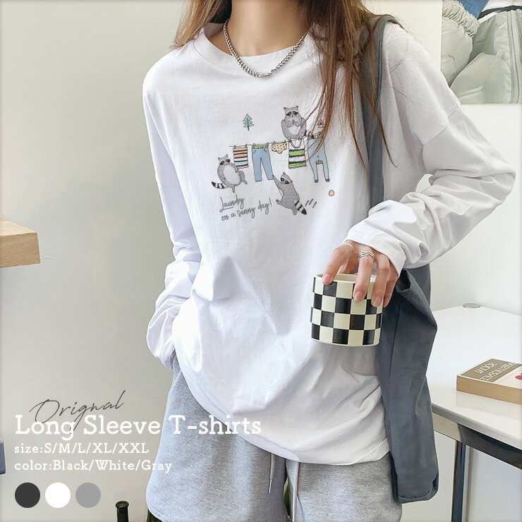 Tシャツ ロンT 長袖 レディース トップス プリントT 丸首 クルーネック レディース Tシャツ 長袖 カットソー レイヤード ロングTシャツ おしゃれ 大人かわいい ペア おそろ ロゴ 秋冬 ビッグT 大きいサイズ アライグマ 洗濯 ランドリー 北欧 ロゴ イラスト