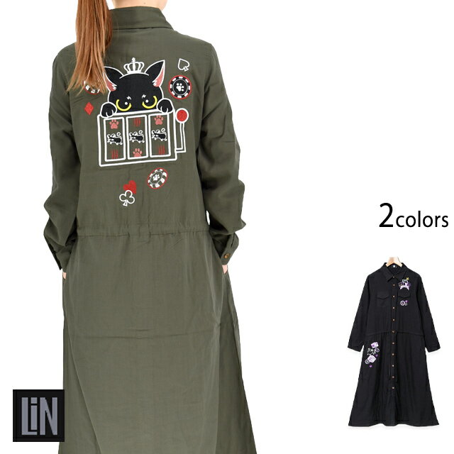 ラミ&アール カジノ長袖シャツワンピース◆LIN/レディースLIN-F02332Detail何でもあり、何でもやる新ブランド「LIN」から「ラミ&アール カジノ長袖シャツワンピース(AL-75502)」のご紹介です。黒猫のLamy(ラミ)とネズミのEarl(アール)。黒猫のラミは日々をのらりくらりと生きる野良。しっかりしているようで少し抜けている天然さん。ネズミのアールは天真爛漫で好奇心旺盛。日々刺激を求めいたずら好き。性格が正反対の二匹は、仲が良いのか悪いのかよくわからない間柄。そんな二匹の日常をデザインに落とし込んだ「Lamy&Earl」の今後の展開をお楽しみに!ラミとアールがカジノで追いかけっこ♪ワッペン風の刺繍が可愛いロングシャツワンピです。ボタンを開けて、羽織り感覚で使うのもおすすめ。袖はロールアップが出来る仕様になっています。ブランドLIN(リン)素材綿100%カラーカーキ・ブラック生産国Made in Chinaサイズ(cm/約)着丈身幅肩幅袖丈M124504059L127534360