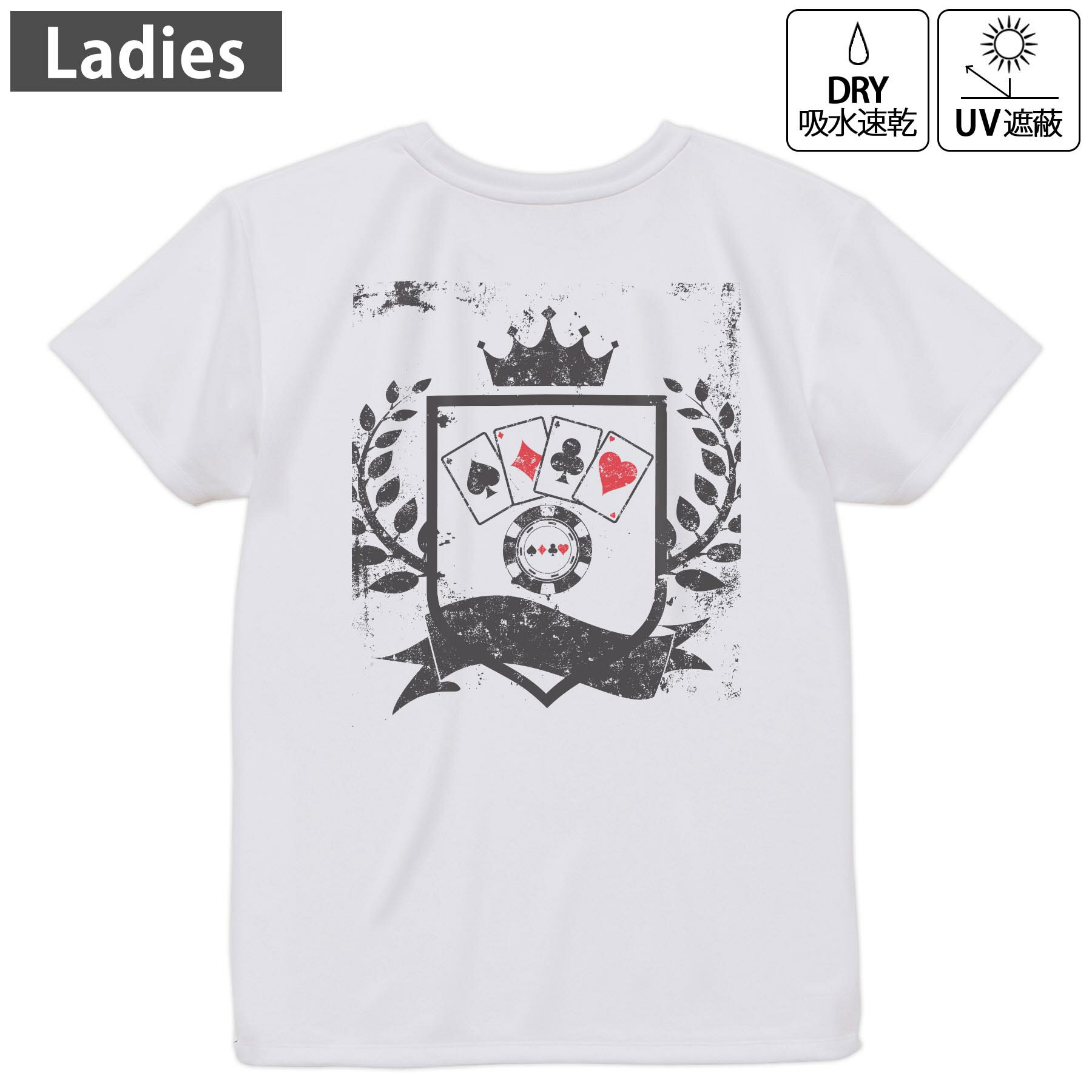 レディース ドライバックプリントTシャツ ホワイト 半袖 4.1オンス ジム トレーニング スポーツ 運動会 ドライアスレチック UVカット 紫外線遮蔽 吸水速乾 デザイン Tshirt M L 008885 モノトーン トランプ カジノ