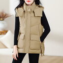 2ベスト レディース 秋冬 韓国風 ゆったり ショート丈 アウター チョッキ 羽織り 上着 ポリエステル 前開き ジップアップ フード付き ストリート カジュアル かわいい おしゃれ オフホワイト ブラック カーキ シャンパンゴールド