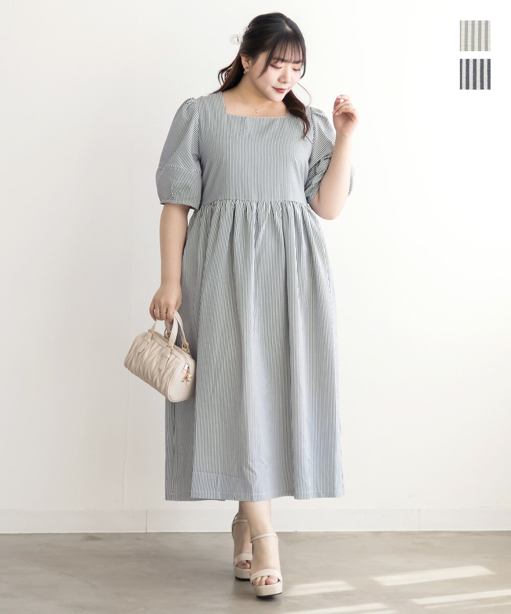 大きいサイズ レディース ウエストリボンサッカーストライプワンピース 【LLサイズ・3Lサイズ・4Lサイズ】【大きいサイズ・レディース】13号・15号・17号・19号・21号・23号