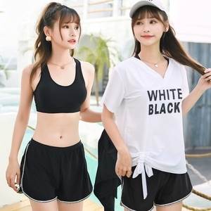 Vネック モノクロ ロゴ サイドリボン 個性的 送料無料 レディース ショートパンツ 半袖 Tシャツ ビキニ 3点セット セットアップ